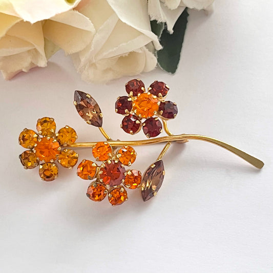 1950s Autumnal Orange & Bronze Diamanté Gold Plated Flower Brooch