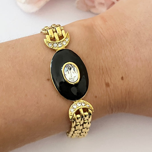 1980s Trifari Black Enamel Diamanté Chain Gold Plated Bracelet