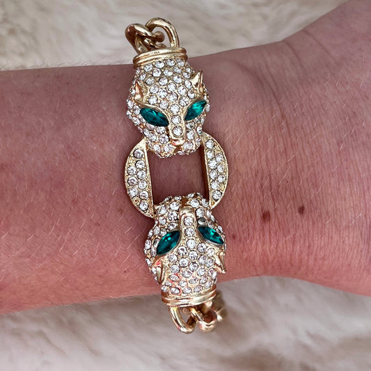 1980s Gold Plated Emerald Diamanté Panther Chain Bracelet