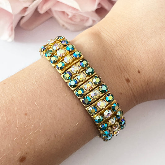 1950s Blue Aurora Borealis Gold Plated Expandable Empire Made Cuff Bracelet
