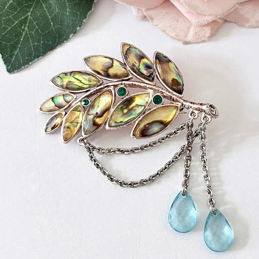 1960s Monet Abalone Shell Blue Bead Dangly Leaf Brooch