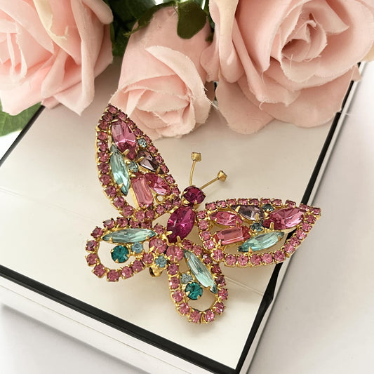 1950s Pink Blue and Lilac Austrian Crystal Sparkly Butterfly Brooch