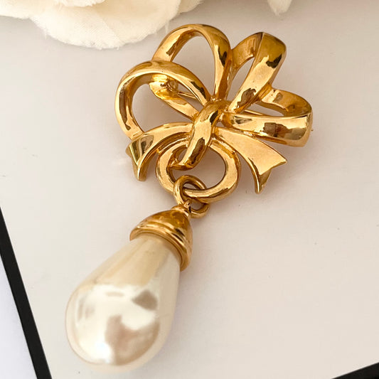 1980s Gold Plated Dangly Faux Pearl Brooch