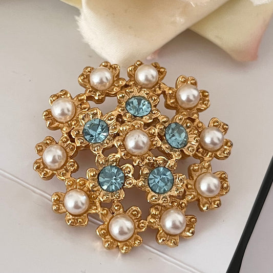 1960s Baby Blue Diamanté Faux Pearl Gold Plated Brooch