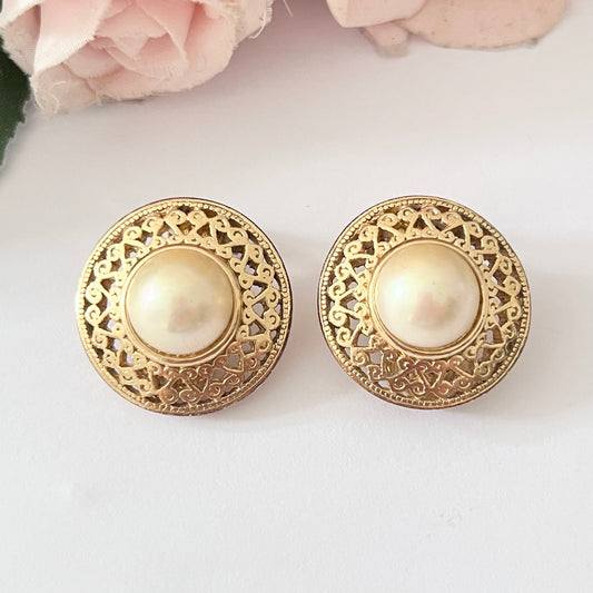 1970s Christian Dior Germany Gold Plated Faux Pearl Circle Clip On Earrings