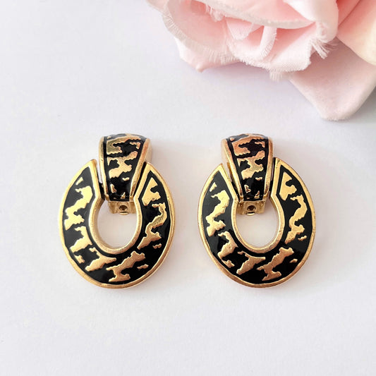 1980s Monet Black Enamel Gold Plated Pierced Statement Earrings
