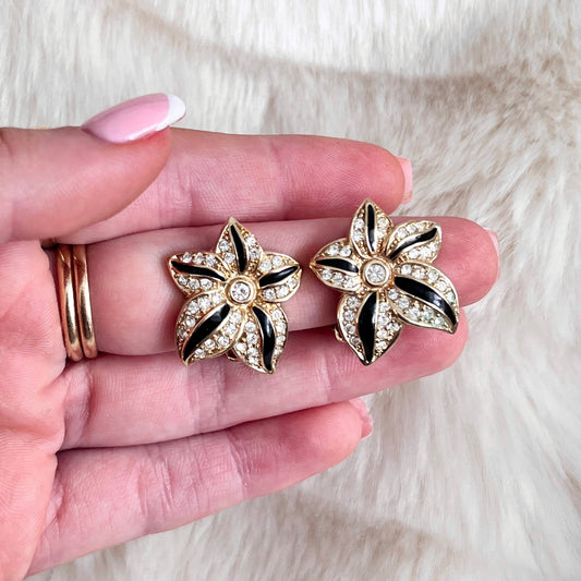 1980s Christian Dior Germany Gold Plated Black Enamel Diamanté Clip On Earrings