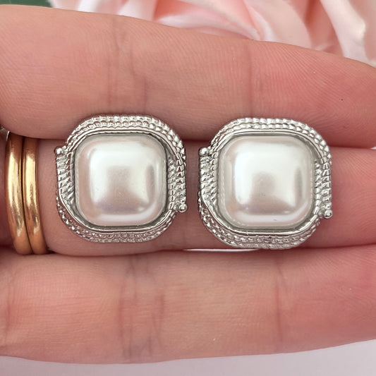 Silver Faux Pearl Square Statement Pierced Earrings
