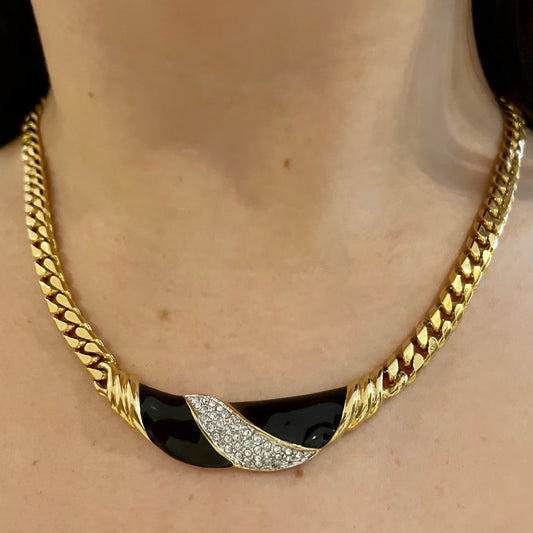 1980s Black Enamel Gold Plated Statement Chain Necklace
