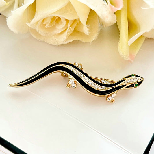 1980s Attwood & Sawyer Black Enamel Gold Plated Diamanté Lizard Brooch
