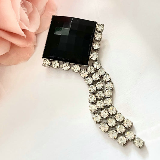 1980s Monochrome Black and Silver Sparkly Diamanté Dangly Brooch