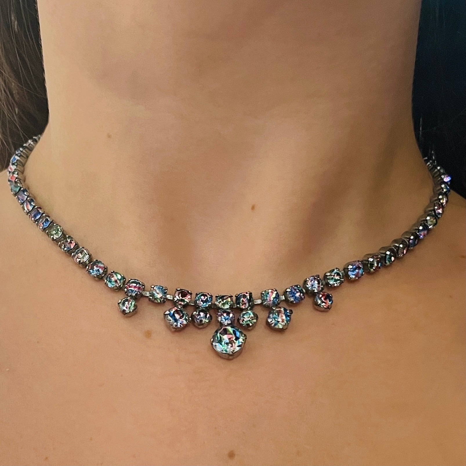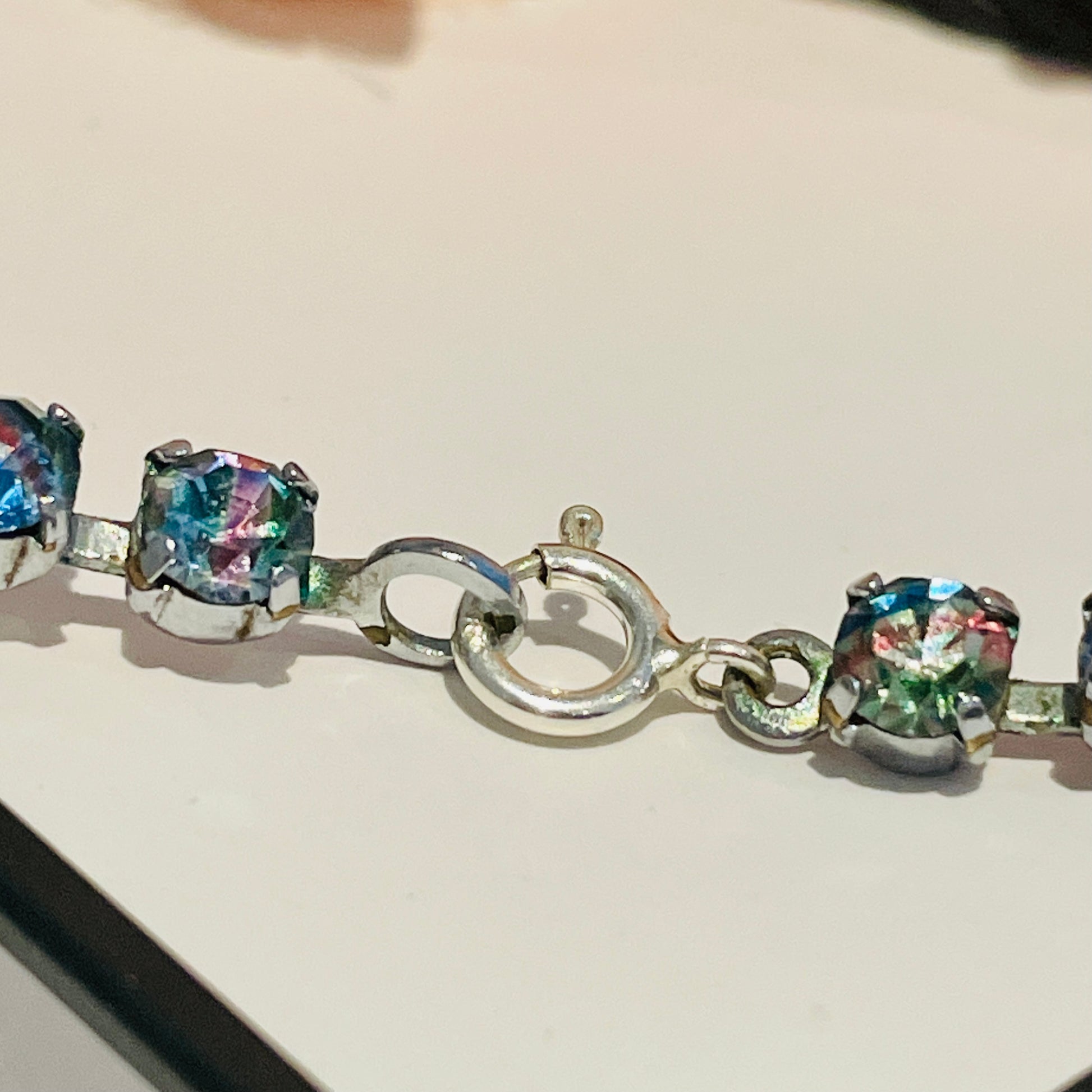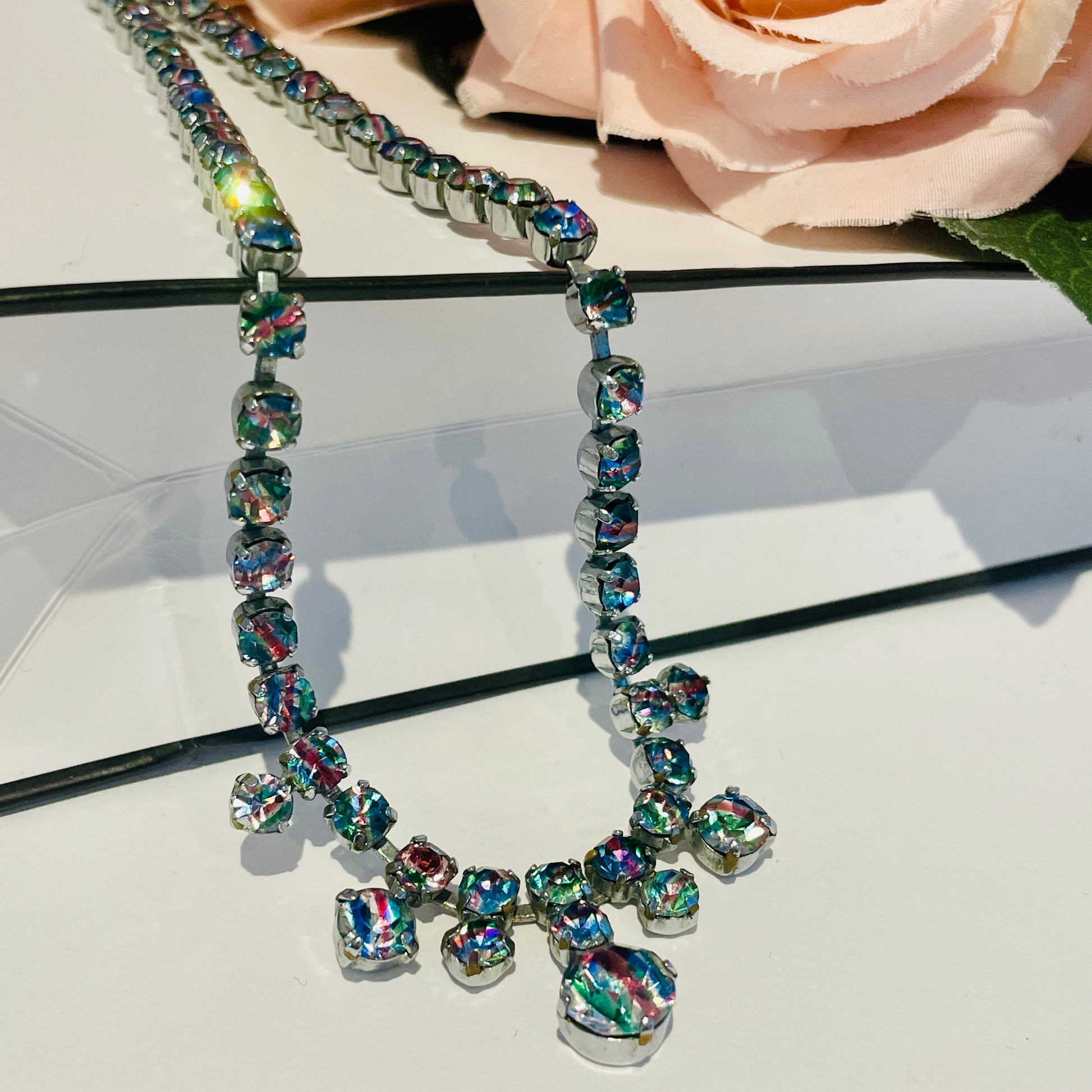 1930s Beautiful Iris Rainbow Crystal Necklace. This beautiful piece of costume jewellery is a true masterpiece of art deco beauty. This necklace features a breathtaking array of iris rainbow crystals stones that show a range of colours: blue, green, and red. Each foil-backed crystal is faceted to perfection, creating a dazzling play of light and colour that will captivate and enchant anyone who sees it.