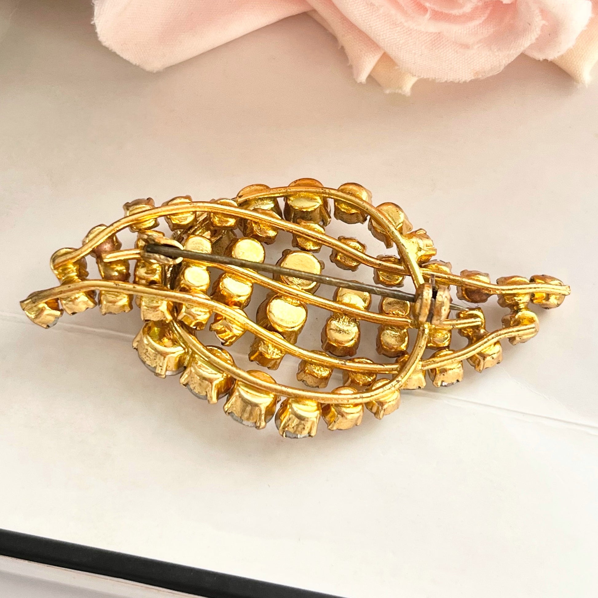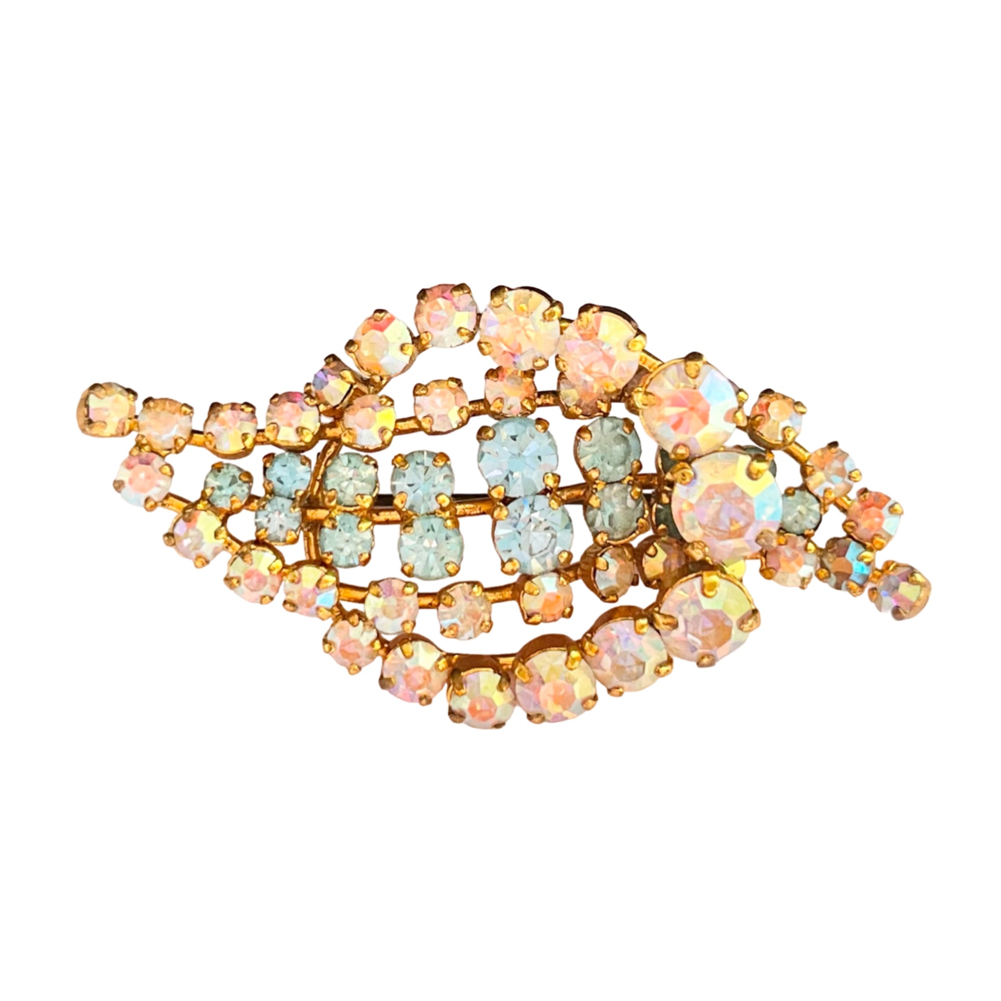 1940s Aurora Borealis Baby Blue Diamanté Gold Plated Leaf Brooch. This stunning vintage piece is a true testament to the elegance and sophistication of the pin up retro 1940s era. Crafted with gold plated metal, this brooch features a delicate leaf design adorned with shimmering aurora borealis stones and bany blue diamantés that capture and reflect light beautifully. With a secure roll-over pin and clasp. This brooch is the perfect accessory to add a touch of vintage charm and glamour to any outfit. Whether you're dressing up for a special occasion, looking for a gift you can’t buy twice or adding a touch of sparkle to your everyday wear, this brooch is sure to make a statement.