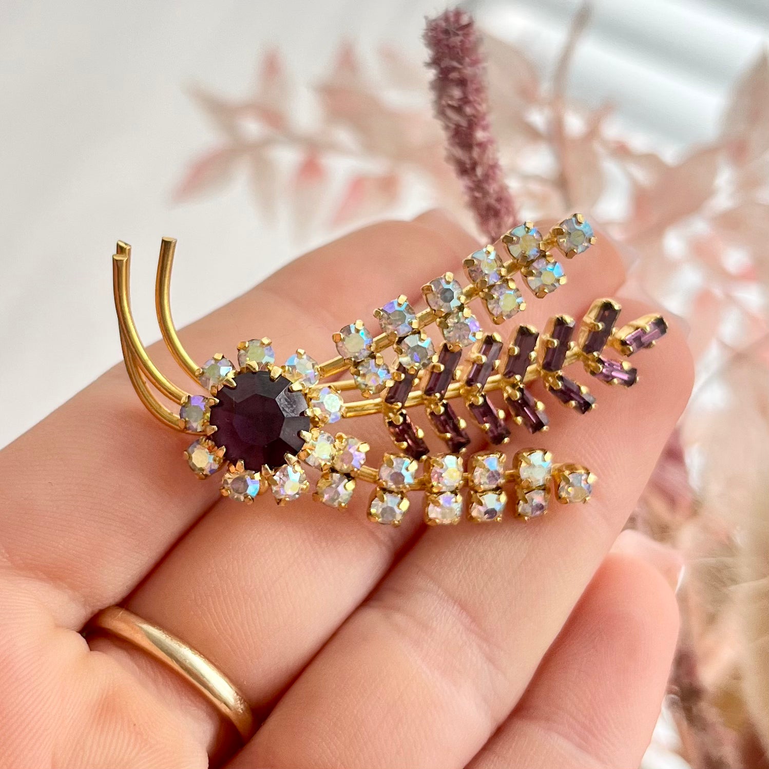 1940s Aurora Borealis Purple Diamanté Gold Plated Floral Spray Brooch. This stunning vintage piece is a true testament to the elegance and sophistication of the pin up retro 1940s era. Crafted with gold plated metal, this brooch features a delicate floral spray design adorned with shimmering aurora borealis stones and purple diamantés that capture and reflect light beautifully. With a secure roll-over pin and clasp. This brooch is the perfect accessory to add a touch of vintage charm and glamour to any outfit. Whether you're dressing up for a special occasion, looking for a gift you can’t buy twice or adding a touch of sparkle to your everyday wear, this brooch is sure to make a statement.