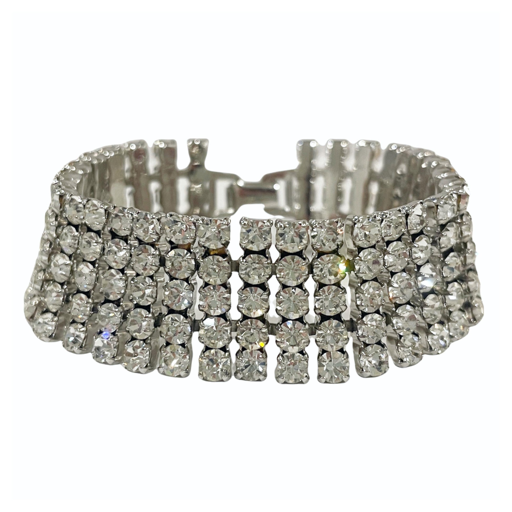 1940s Diamanté Statement Bracelet, a stunning piece of vintage costume jewellery that is sure to add a touch of glamour to any outfit. This bracelet is a beautiful example of the glamour that came in the Old Hollywood Era. Featuring a dazzling array of diamanté stones set in a silver-tone metal, this 5-row bracelet will make a statement. The stones catch the light beautifully, creating a sparkling effect that is sure to turn heads. This bracelet sits comfortably on the wrist, and its secure hinged clip clasp ensures that it stays in place. Whether worn on its own or paired with other vintage pieces, this bracelet is sure to make a bold statement and become a beloved addition to your jewellery collection. It also makes for the perfect gift for any Marilyn Monroe Old Hollywood lover!