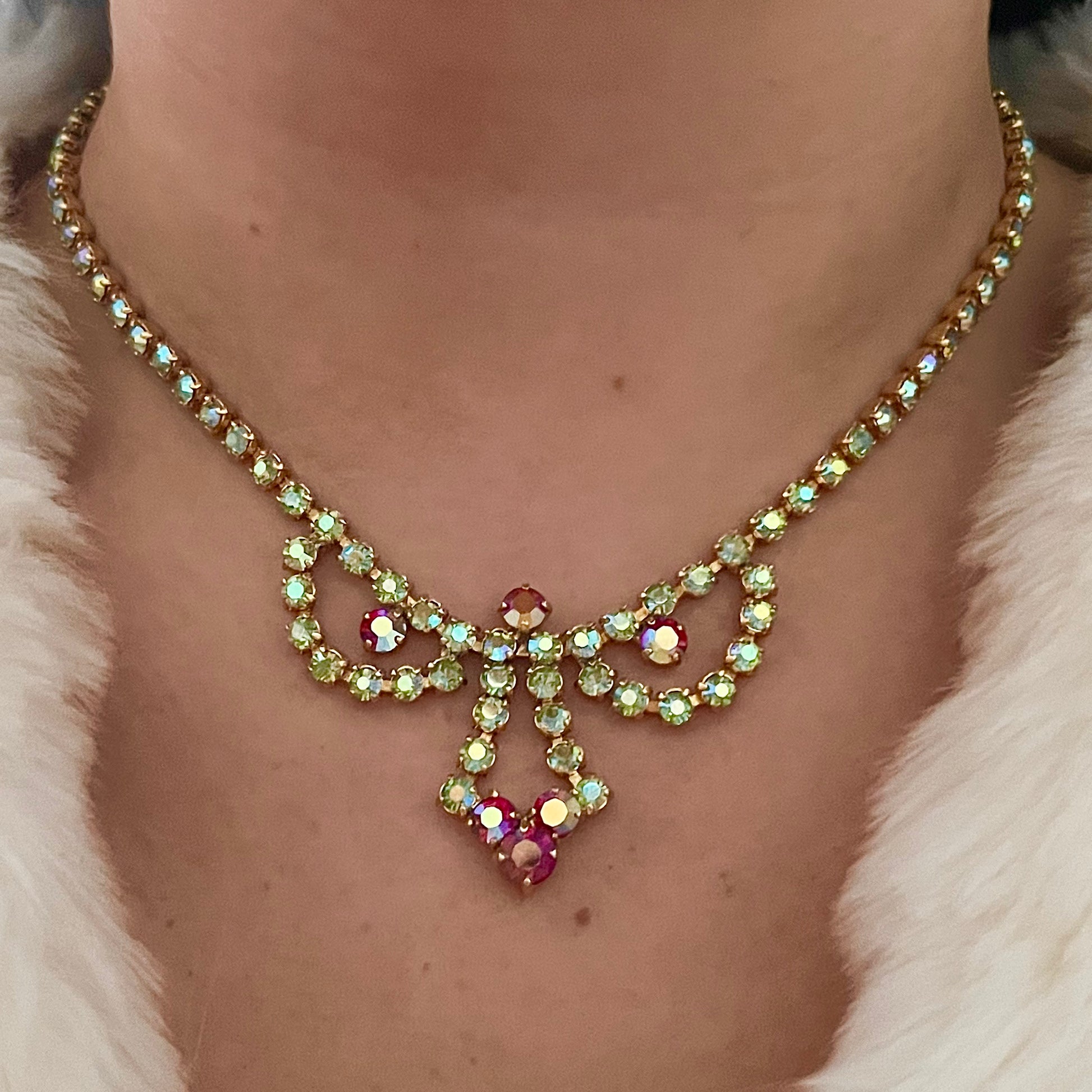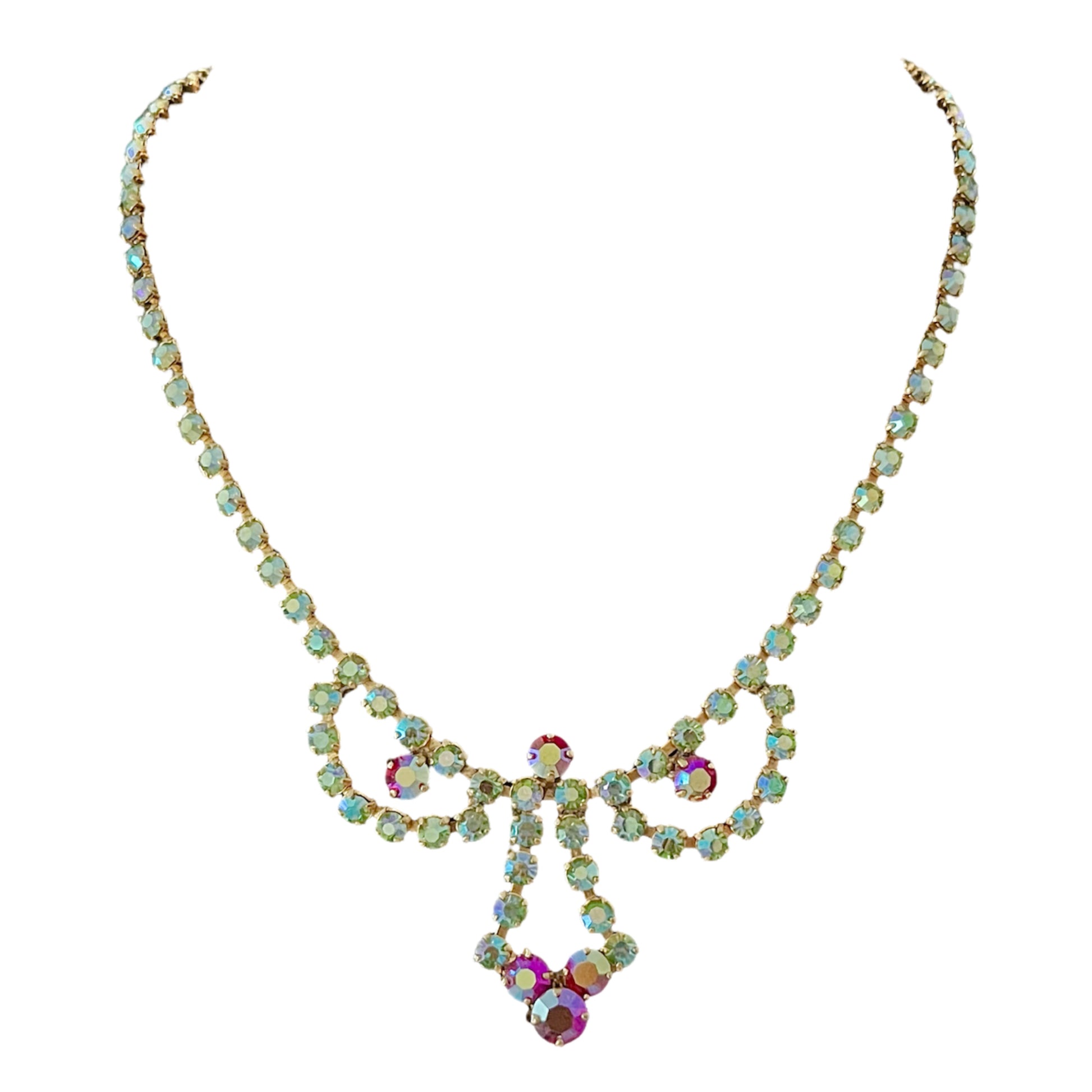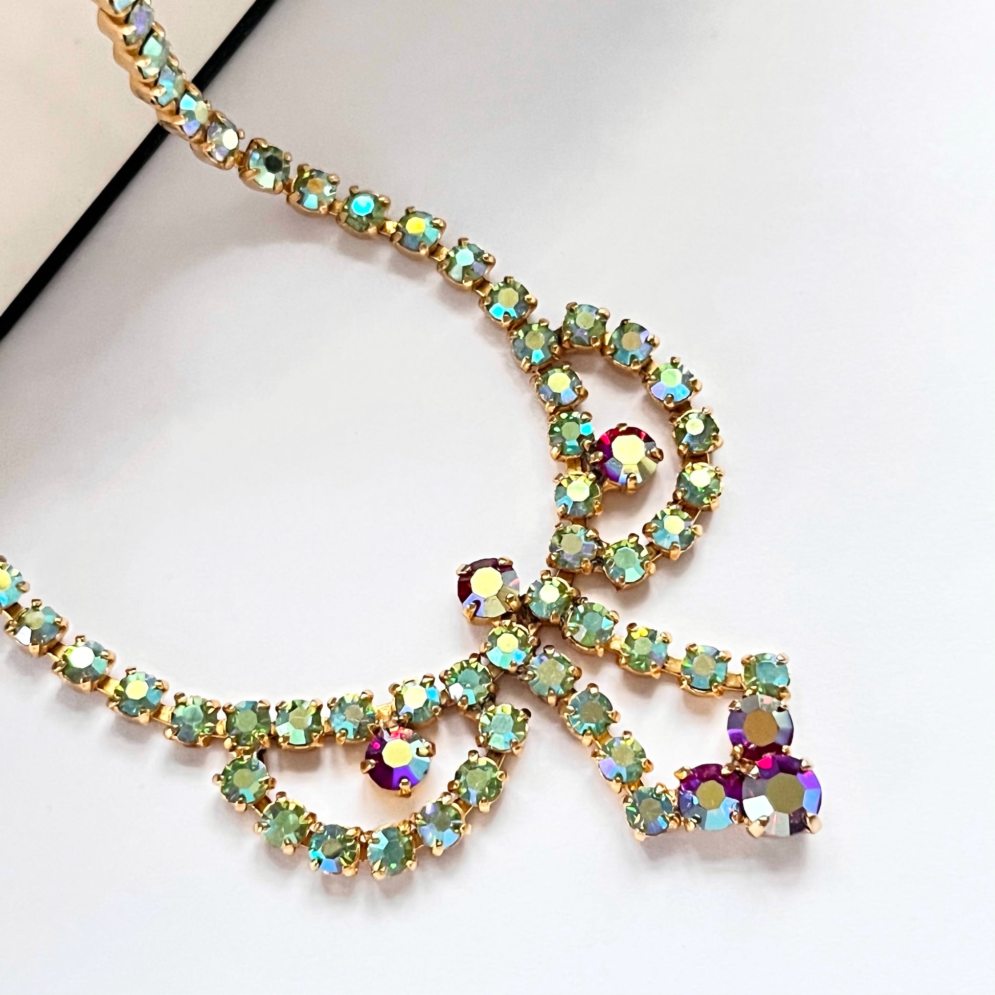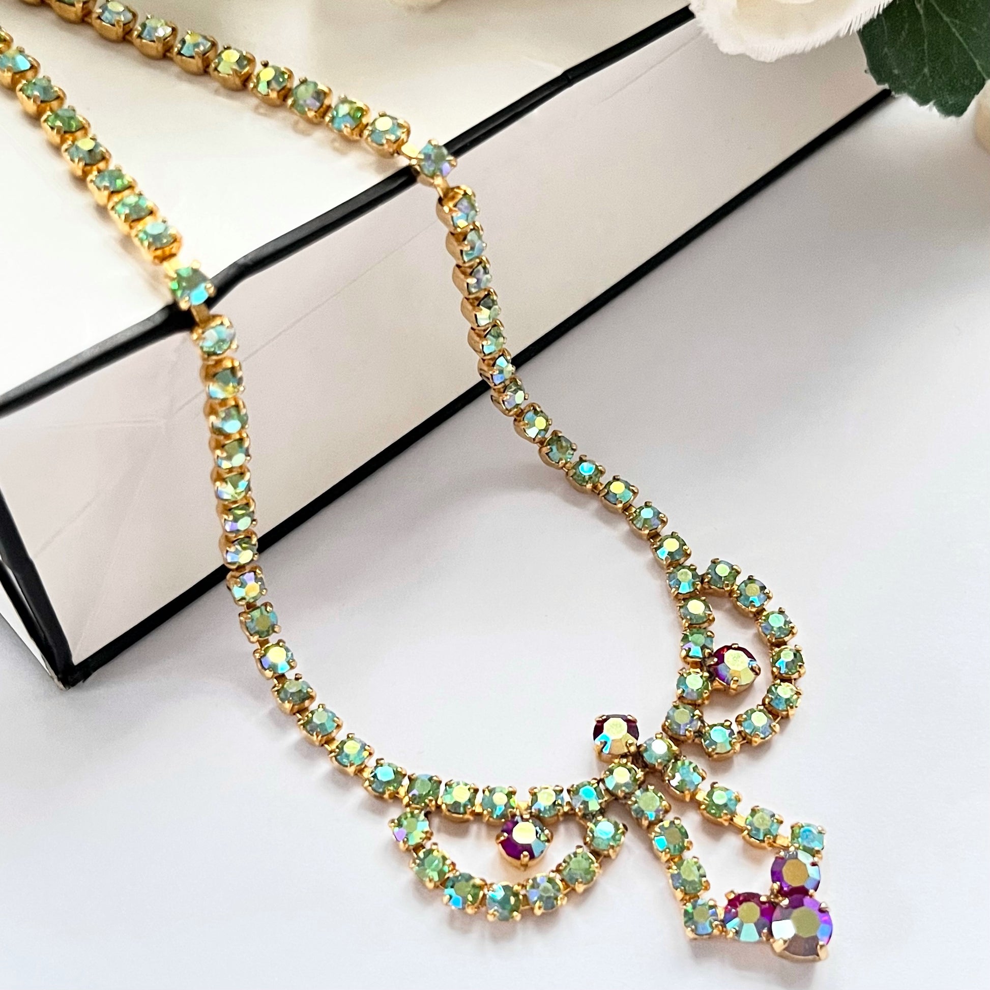 1950s Aqua Blue and Red Aurora Borealis Gold Plated Statement Necklace. This piece is an exquisite example of 1950s vintage costume jewellery. Crafted with gold plated metal, the necklace boasts a dazzling array of iridescent aqua blue and red Aurora Borealis stones that reflect light in every direction. These shimmering stones catch the eye and create a stunning visual effect, making this piece perfect for dressing up any outfit. This necklace sits beautifully on the neckline and is suitable for a wide range of occasions. Whether you wear it for a special occasion or add a touch of glamour to a casual outfit, this Old Hollywood necklace is sure to impress. The necklace also features a secure lobster claw clasp closure that ensures it stays in place throughout the day or evening. It comes beautifully presented in a Vintage Amara branded gift box, making it the perfect gift for a loved one or a treat for yourself. It’s timeless addition to your jewellery collection that will be cherished for years to come.