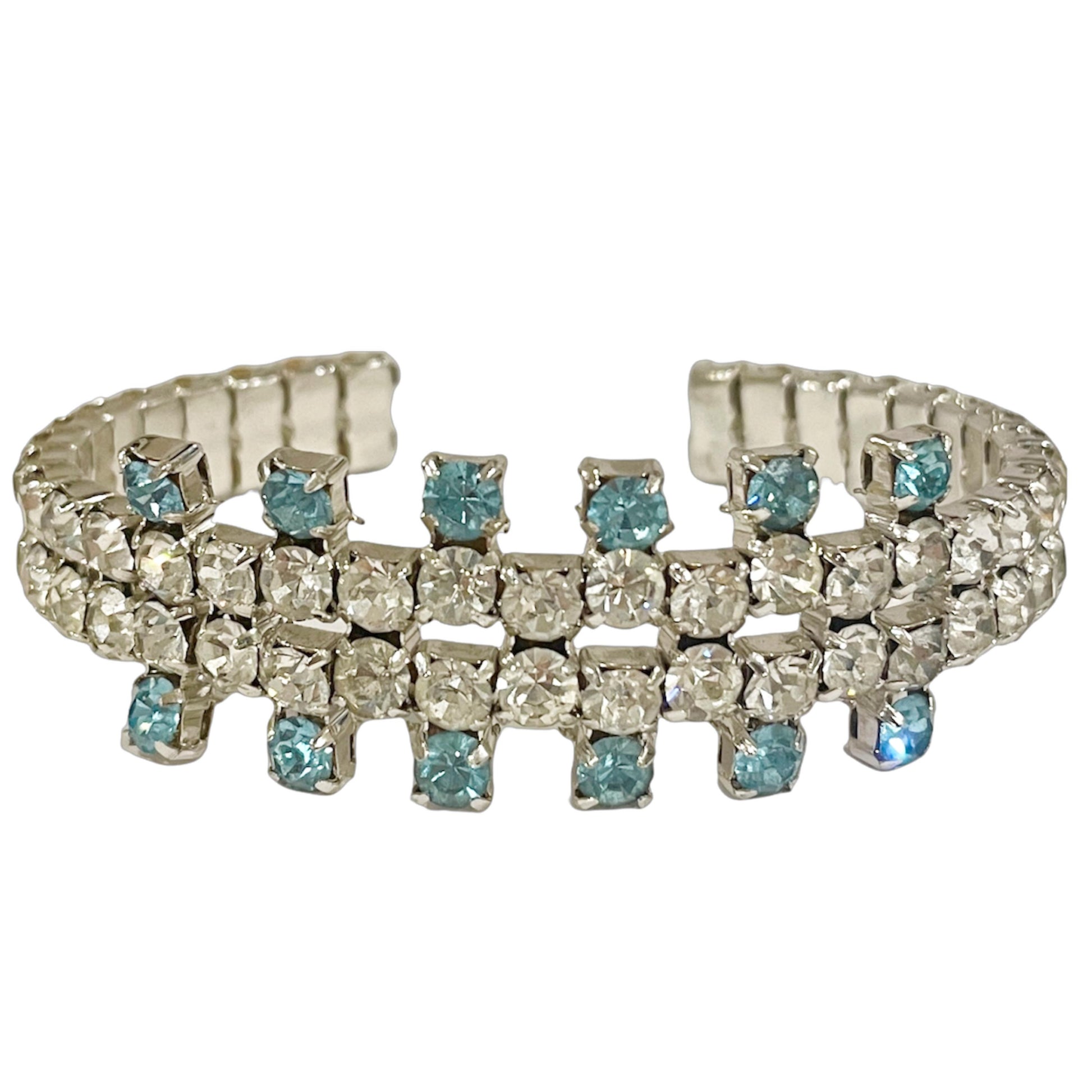 This gorgeous bracelet is vintage from the 1950s. Lined with sparkling silver and baby blue diamantés, this silver tone bracelet sparkles in any lighting and is hard to miss! Bracelet band width: 2cm. Bracelet circumference: 6.5 inches, but can easily sit on any size wrist.