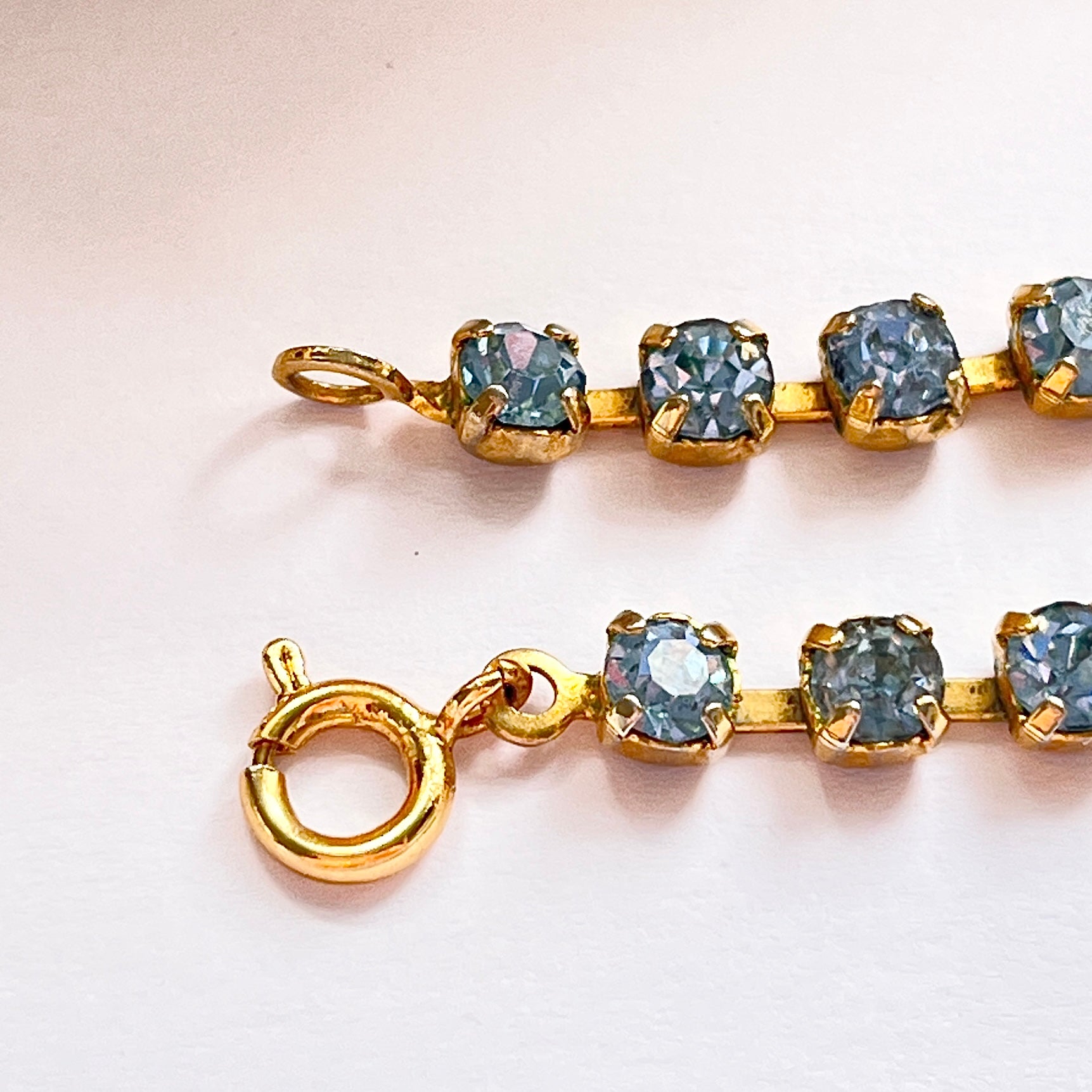 1950s Denim Blue Diamanté Sparkly Gold Plated Necklace. Crafted with gold plated metal, the necklace boasts a beautiful array of denim-coloured blue diamantés. This necklace sits beautifully on the neckline. The necklace also features a secure lobster claw clasp closure that ensures it stays in place throughout the day or evening. It comes beautifully presented in a Vintage Amara branded gift box.