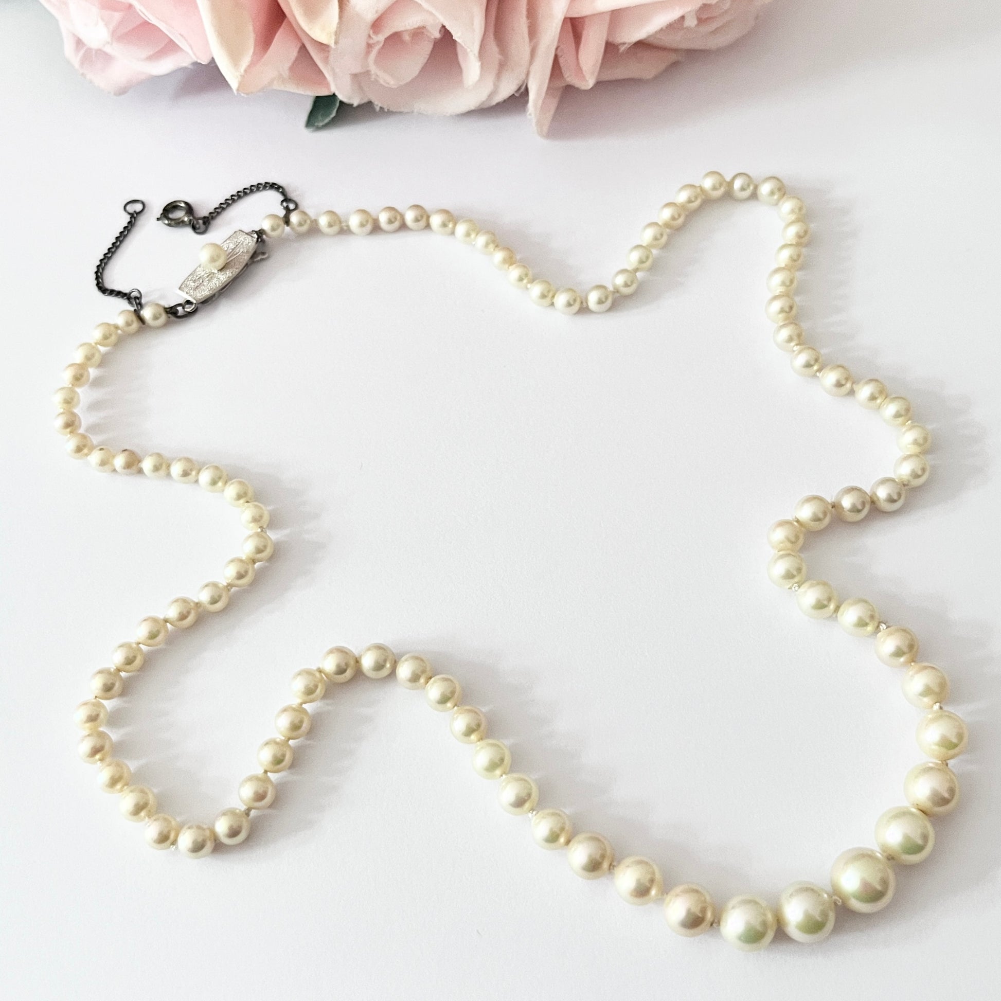 Vintage from the 1950s. Necklace length: 20.5 inches / 52cm. Largest pearl width: 7mm.