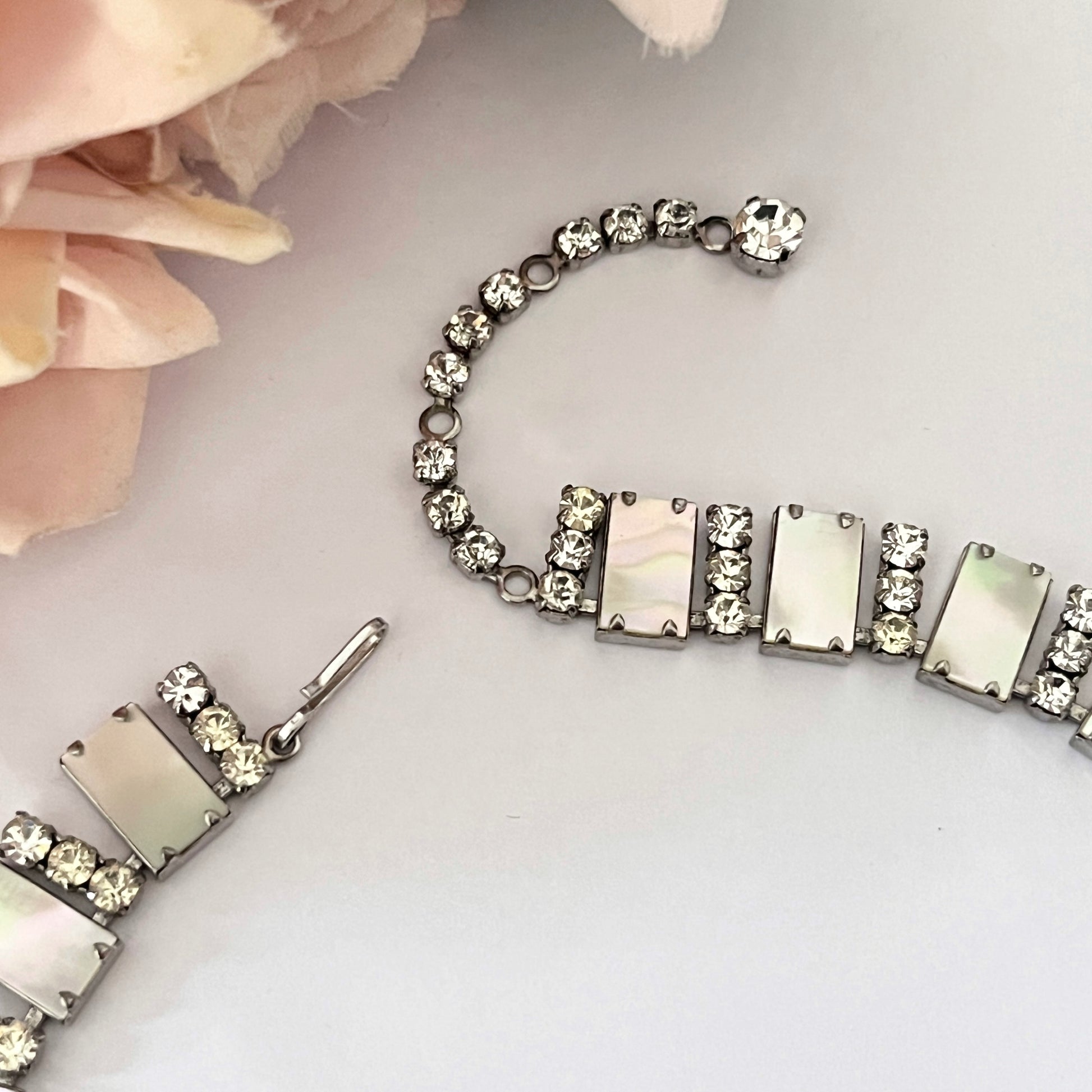 1950s Mother Of Pearl Diamanté Statement Collar Necklace. A beautiful necklace that’s vintage from the 1950s. Lined with mother of pearls and sparkly diamanté stones.