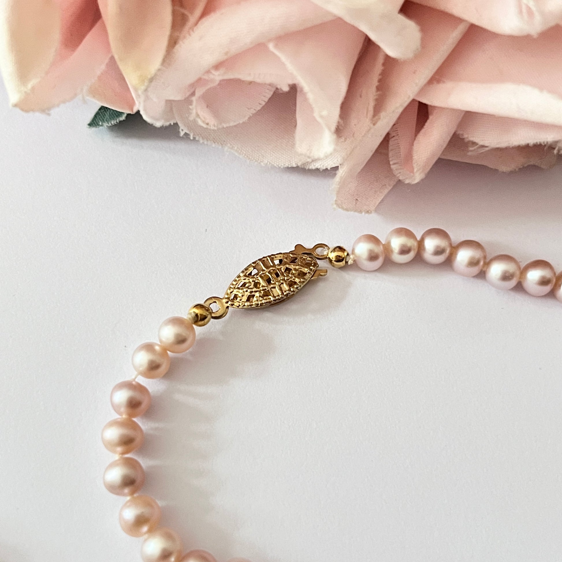 1950s Pink Cultured Pearl Gold Plated Clasp Necklace. A beautiful necklace that’s vintage from the 1950s. Lined with pink cultured pearl, with a gold plated clasp.