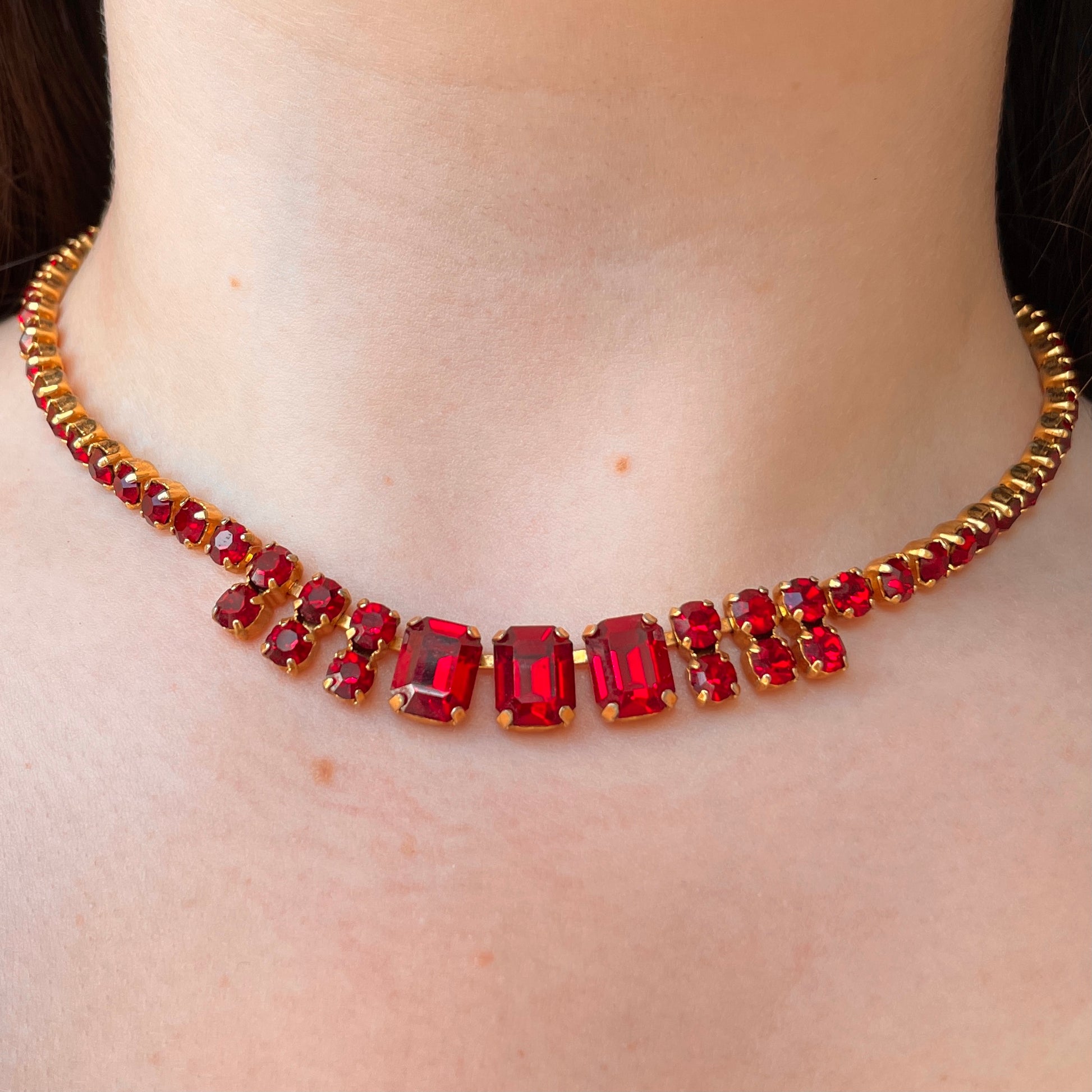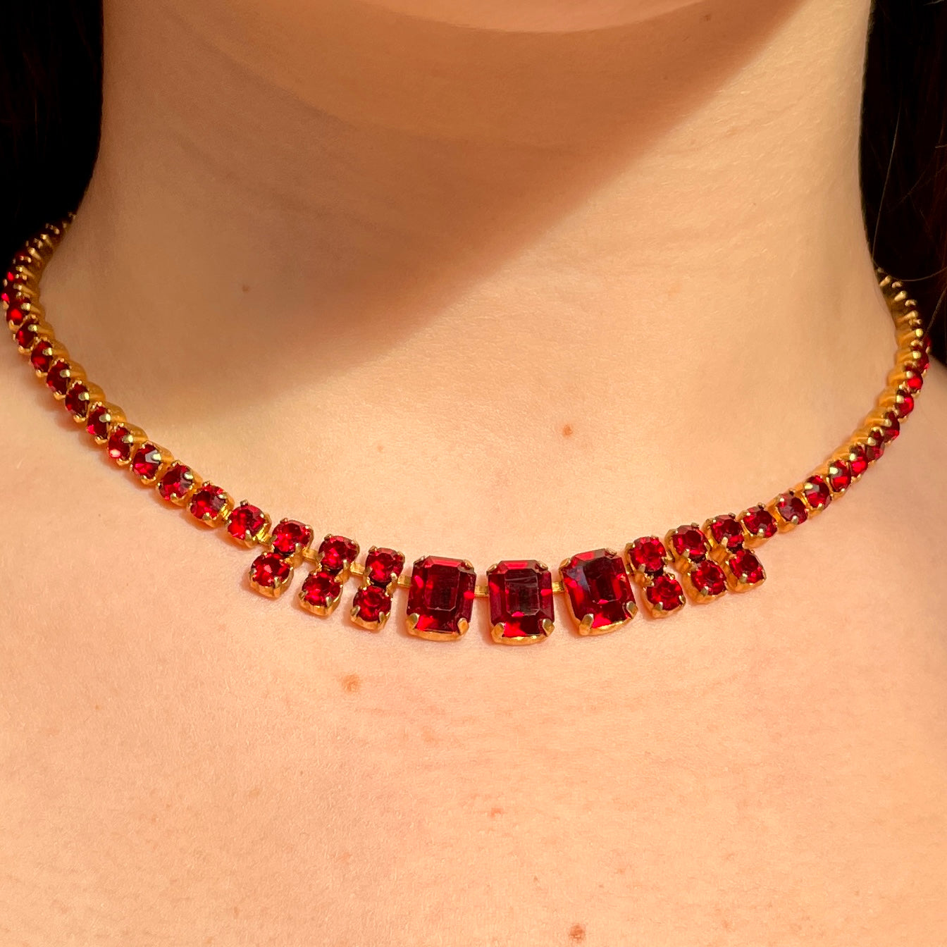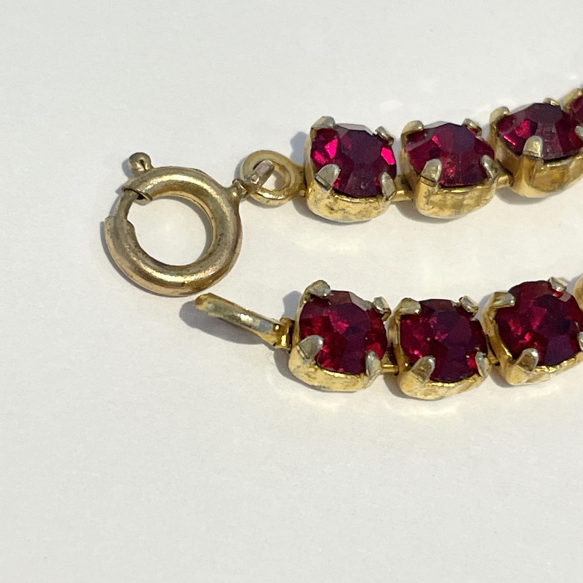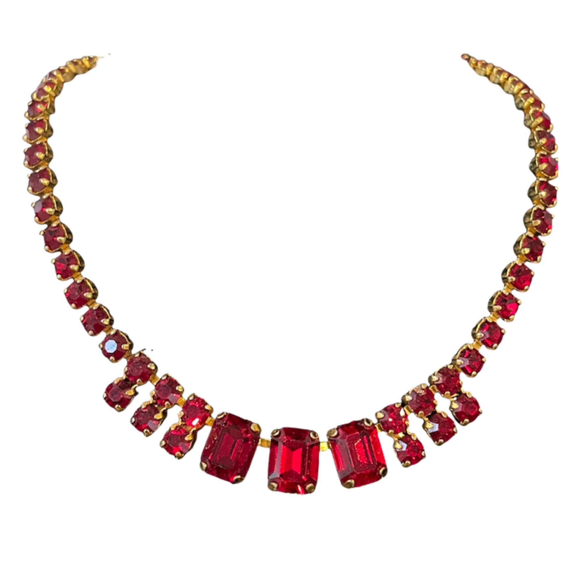 1950s Ruby Red Sparkling Necklace. This exquisite piece of vintage costume jewellery is a pretty accessory and is a timeless addition to any vintage costume jewellery collection. Crafted with gold plated metal, the necklace boasts a beautiful array of ruby red diamantés. This necklace sits beautifully on the neckline and is suitable for a wide range of occasions. The necklace also features a secure lobster clasp closure that ensures it stays in place throughout the day or evening. It comes beautifully presented in a Vintage Amara branded gift box, making it the perfect gift for a loved one or a treat for yourself. Whether you wear it with a simple cocktail dress or add a touch of Old Hollywood glamour to a casual outfit, this necklace is sure to impress. It’s timeless design and sparkling stones make it a treasure that will be cherished for years to come.