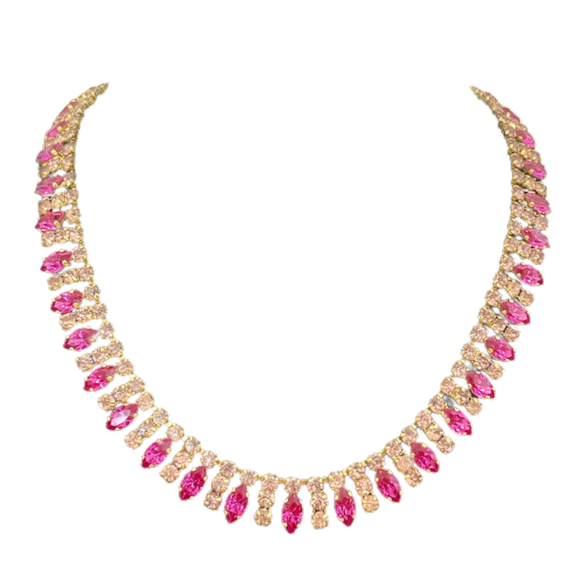 1950s Statement Lilac and Hot Pink Diamanté Bling Necklace. This exquisite piece of vintage costume jewellery is a pretty accessory and is a timeless addition to any vintage costume jewellery collection. Crafted with gold plated metal, the necklace boasts a beautiful array of lilac and hot pink diamantés. This necklace sits beautifully on the neckline and is suitable for a wide range of occasions. The necklace also features a secure hook closure that ensures it stays in place throughout the day or evening. It comes beautifully presented in a Vintage Amara branded gift box, making it the perfect gift for a loved one or a treat for yourself. Whether you wear it with a simple cocktail dress or add a touch of Old Hollywood glamour to a casual outfit, this necklace is sure to impress. It’s timeless design and sparkling stones make it a treasure that will be cherished for years to come.