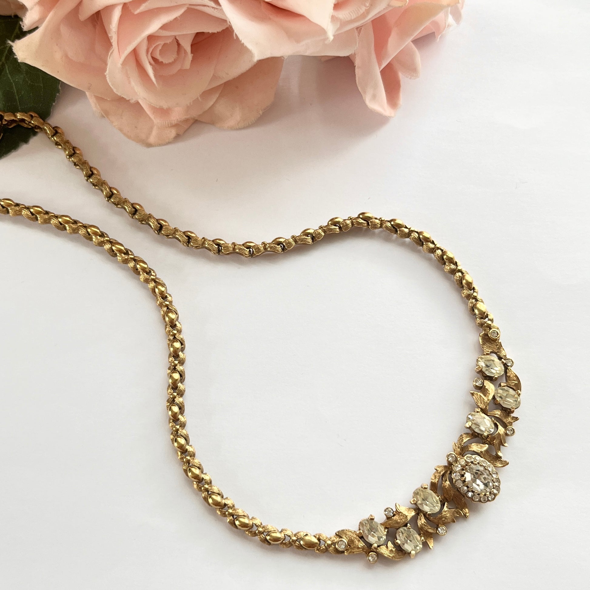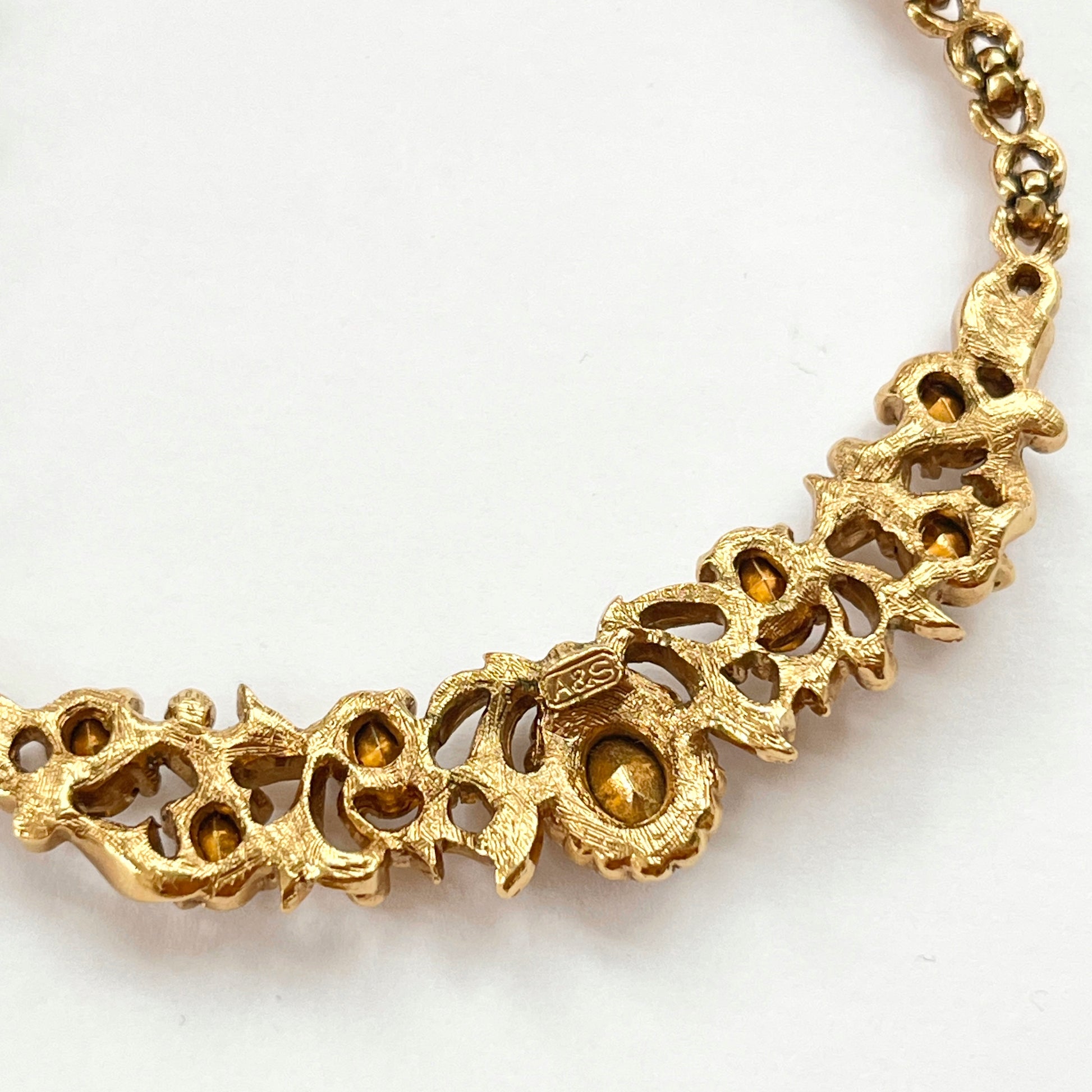 1960s Attwood & Sawyer Diamanté Brushed Gold Plated Necklace. This stunning costume necklace really is a statement piece. Crafted with exceptional quality and attention to detail, this vintage necklace features brushed gold plating and sparkling diamantés. The necklace showcases a timeless elegance that was present in the mid century 1960s era. This designer necklace is a perfect gift for the signed vintage costume jewellery collector or anyone who appreciates the classic beauty of vintage pieces. It comes in a beautiful gift box, ready to be presented to your loved one or to add to your personal Attwood and Sawyer collection. Marked A&S on its reverse, a testament to their authenticity and quality. (Does not come in the original designer box unless stated otherwise).