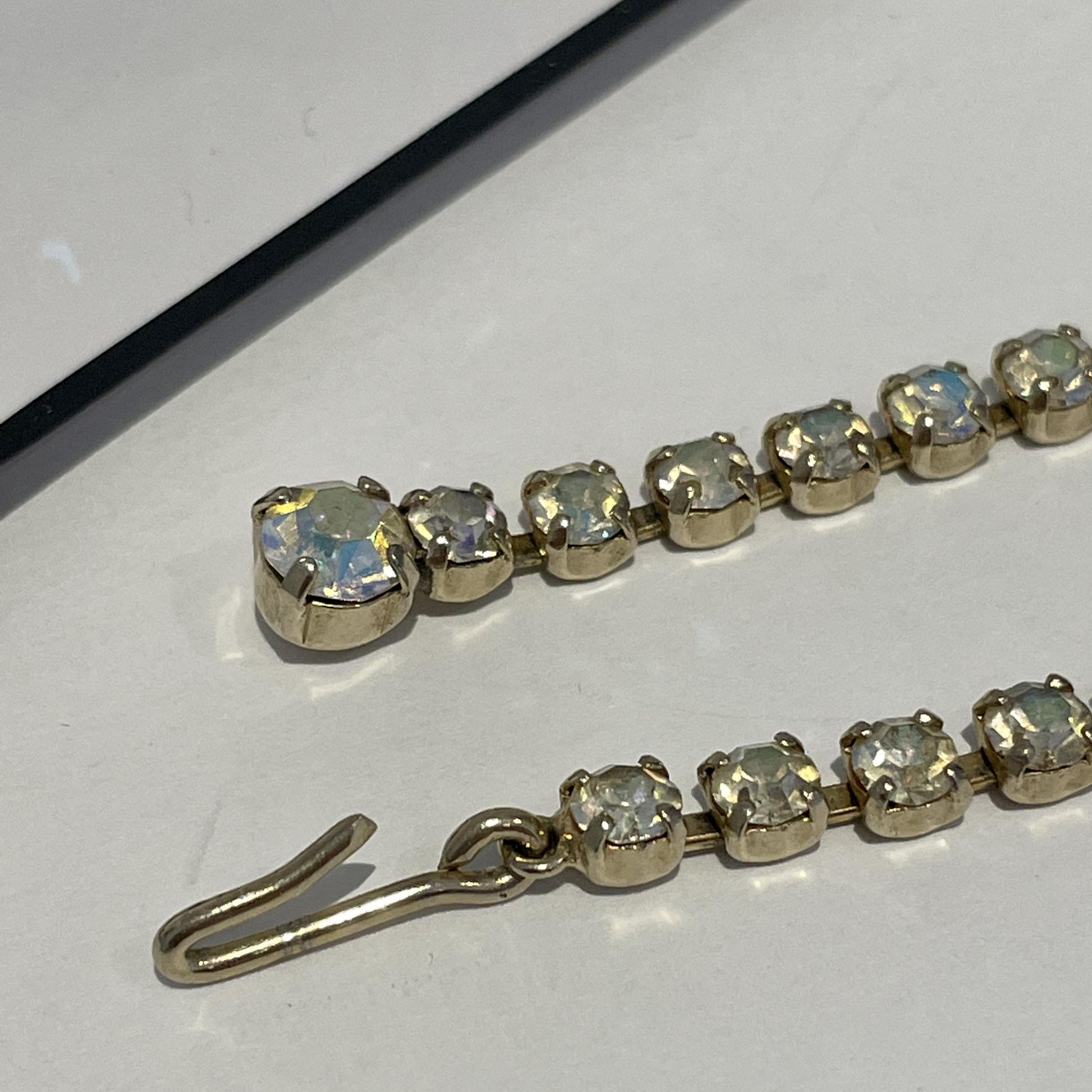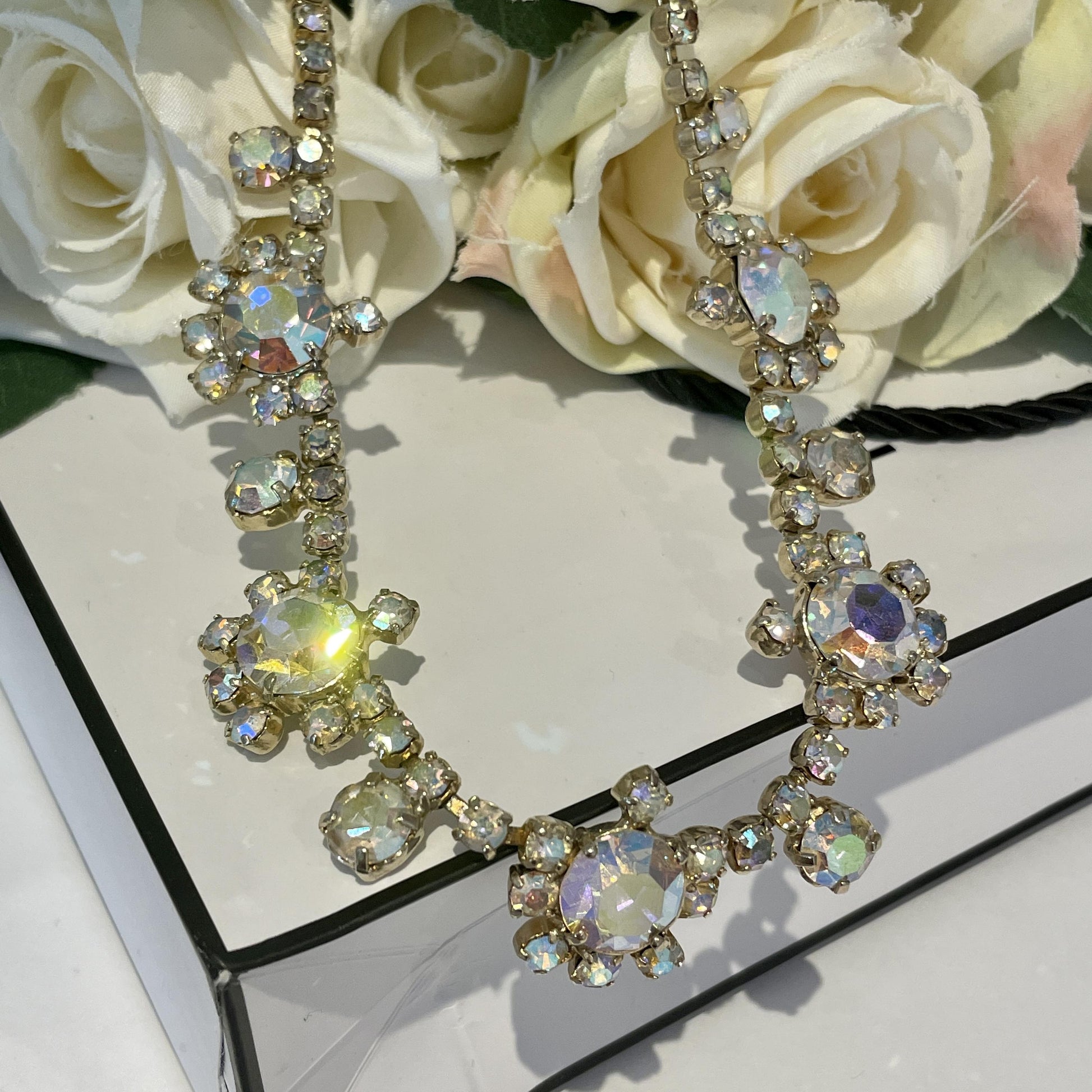 1960s Aurora Borealis Rhinestone Statement Necklace. This piece is an exquisite example of 1960s vintage costume jewellery. Crafted with gold plated metal, the necklace boasts a dazzling array of iridescent Aurora Borealis rhinestones that reflect light in every direction. These shimmering stones catch the eye and create a stunning visual effect, making this piece perfect for dressing up any outfit. This necklace sits beautifully on the neckline and is suitable for a wide range of occasions. Whether you wear it for a special occasion or add a touch of glamour to a casual outfit, this mid-century necklace is sure to impress. The necklace also features a hook closure that ensures it stays in place throughout the day or evening. It comes beautifully presented in a Vintage Amara branded gift box, making it the perfect gift for a loved one or a treat for yourself. It’s timeless addition to your jewellery collection that will be cherished for years to come.