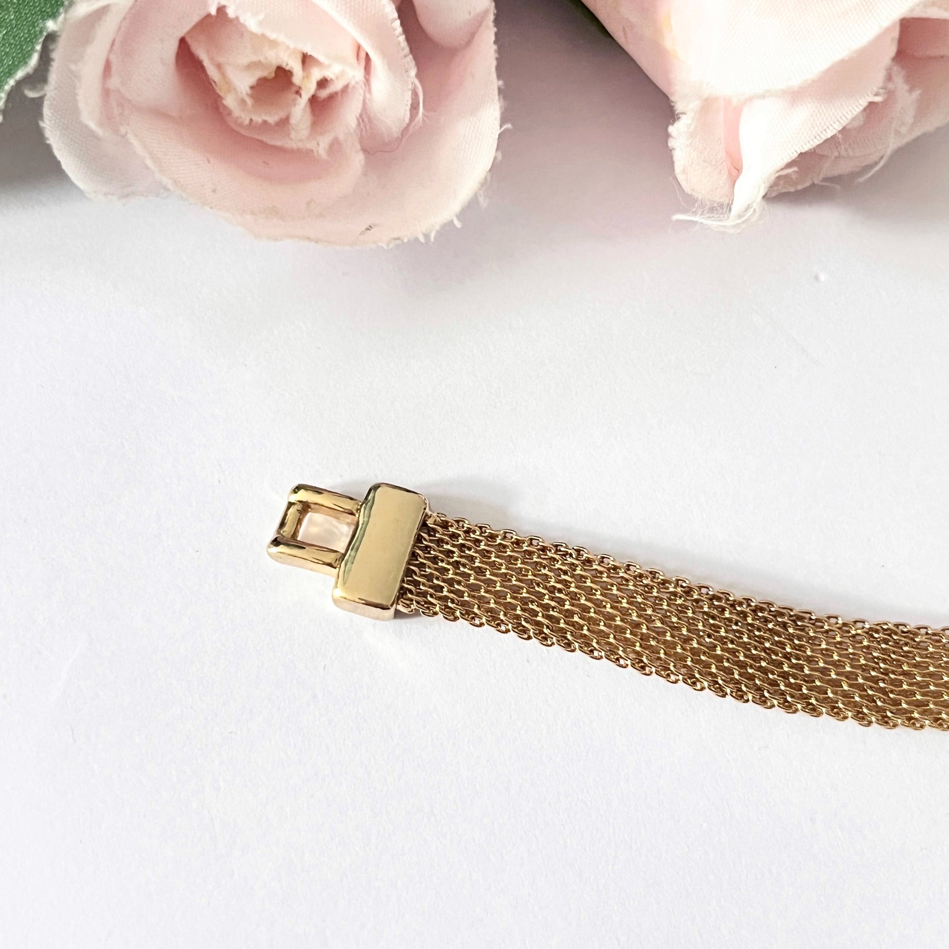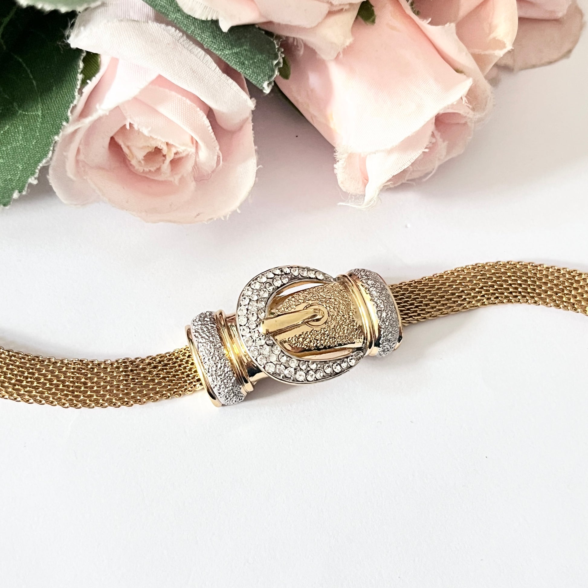 1960s Gold Plated Diamanté Buckle Bracelet. A beautiful gold plated statement bracelet that features a diamantés encrusted buckle. Worn securely with its hinge clasp. Vintage from the 1960s. This bracelet is in great quality considering it’s vintage age.