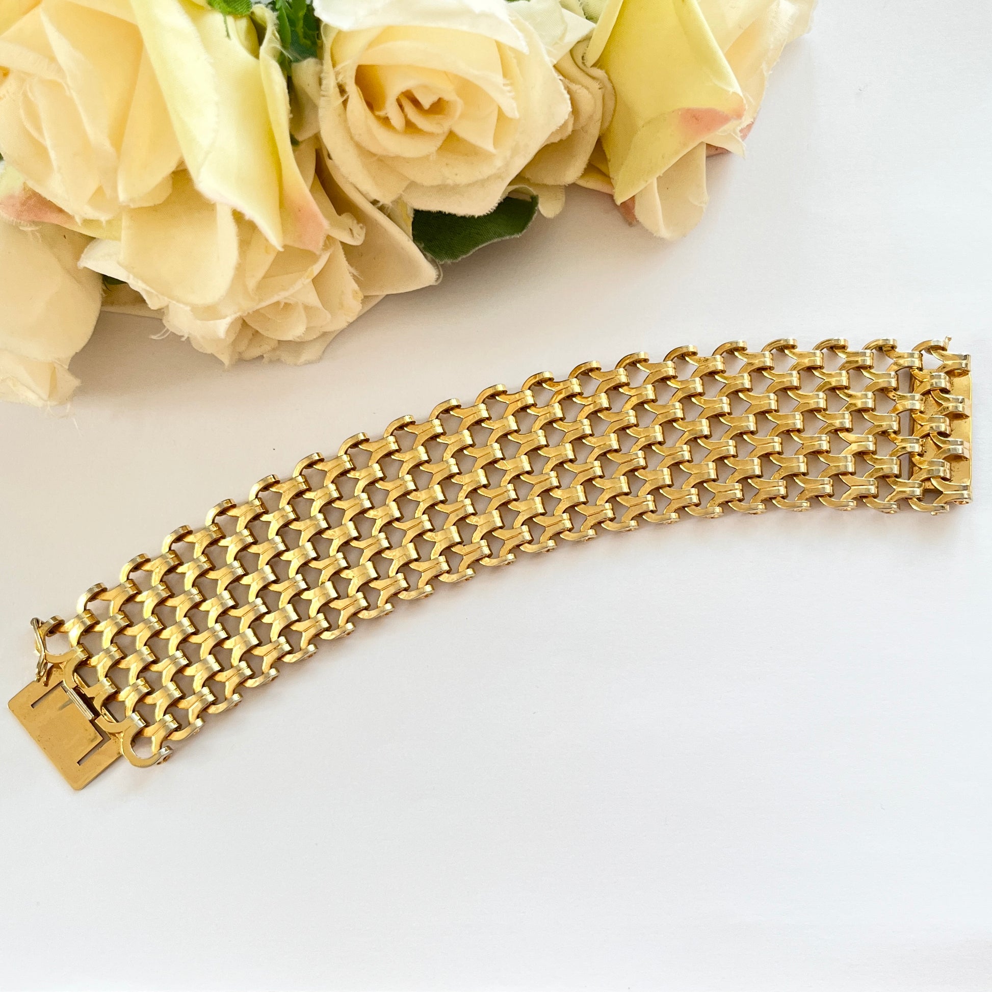 1960s Grossé Gold Plated Chunky Chain Bracelet. Crafted with exquisite attention to detail, this bracelet boasts a classic design that never goes out of style. The Grossé bracelet features a series of interlocking links. Made from high-quality materials that Grossé is renowned for, this bracelet is a great addition to any signed vintage costume jewellery collection. The safety clasp ensures a secure fit, so you can wear it with confidence. It comes in a beautiful gift box, ready to be presented to your loved one or to add to your personal Grossé collection. The bracelet comes complete with the signature Grossé logo marked on the reverse of the clasp, a testament to their authenticity and quality. (Does not come in original designer box unless stated otherwise.)