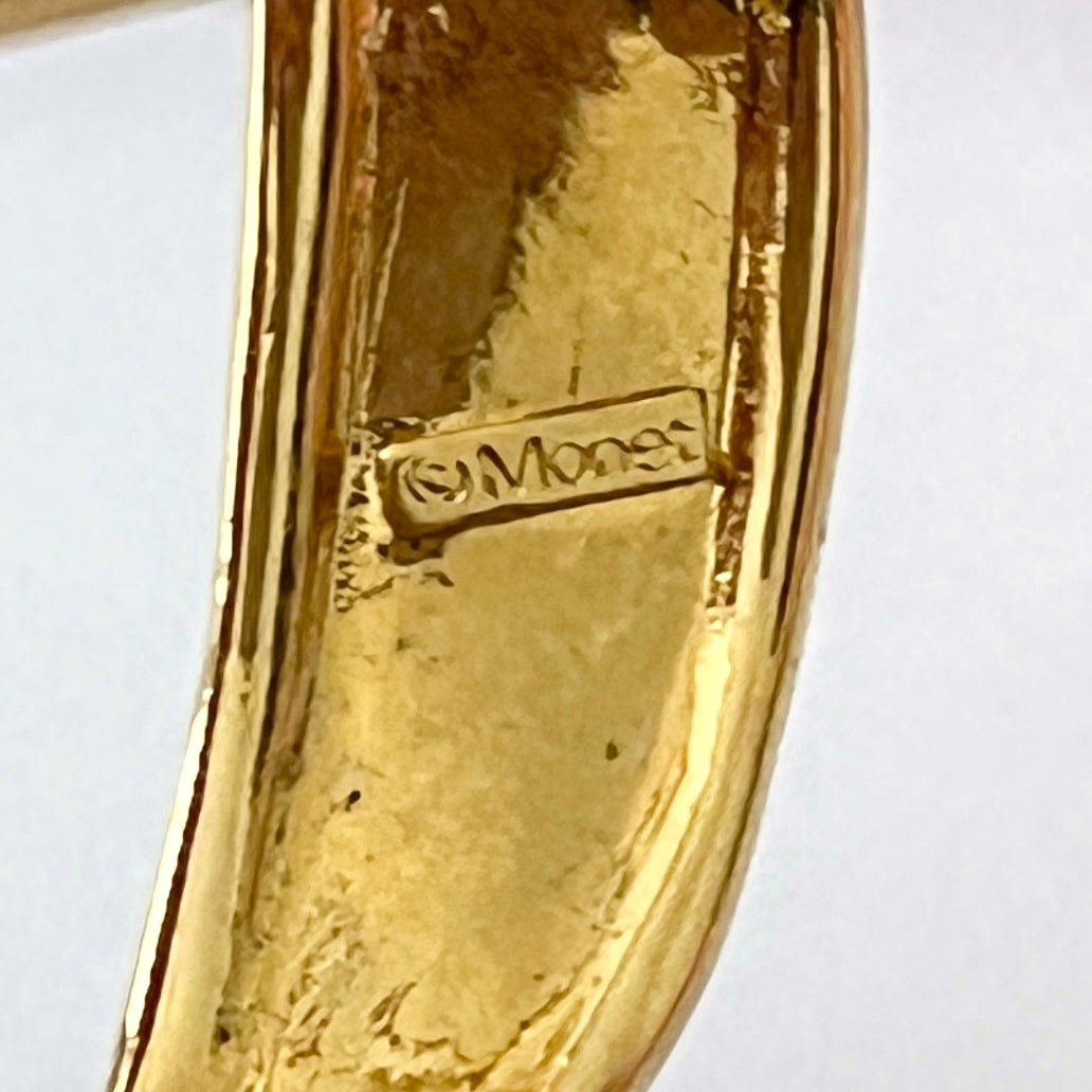 1960s Monet Gold Plated Brooch. Crafted from high-quality gold-plated metal, this brooch sits securely on with its rollover pin clasp. The brooch comes complete with the signature Monet logo marked on the reverse, a testament to its authenticity and quality. Whether it be for a Monet collector or for a lover of signed vintage costume jewellery, this Monet brooch is the perfect addition to your jewellery collection. Has vintage wear marks due to it's age. (Does not come in original box unless stated otherwise.)