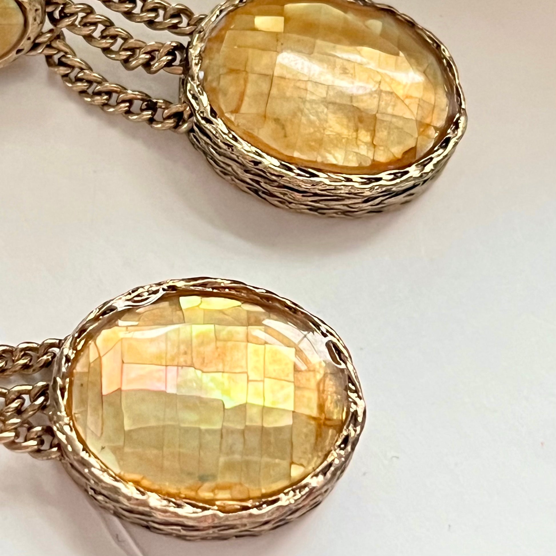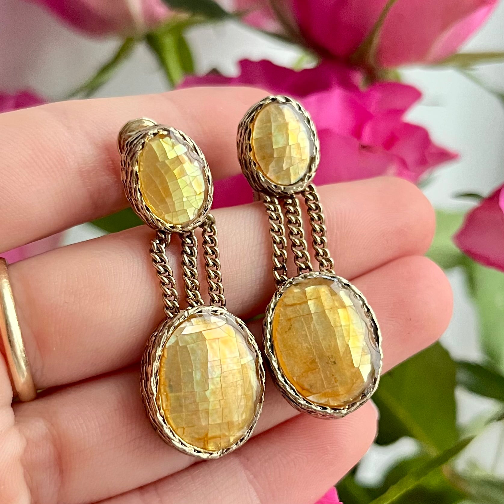 1960s Monet Golden Amber Enamel Gold Plated Dangly Chain Clip On Earrings