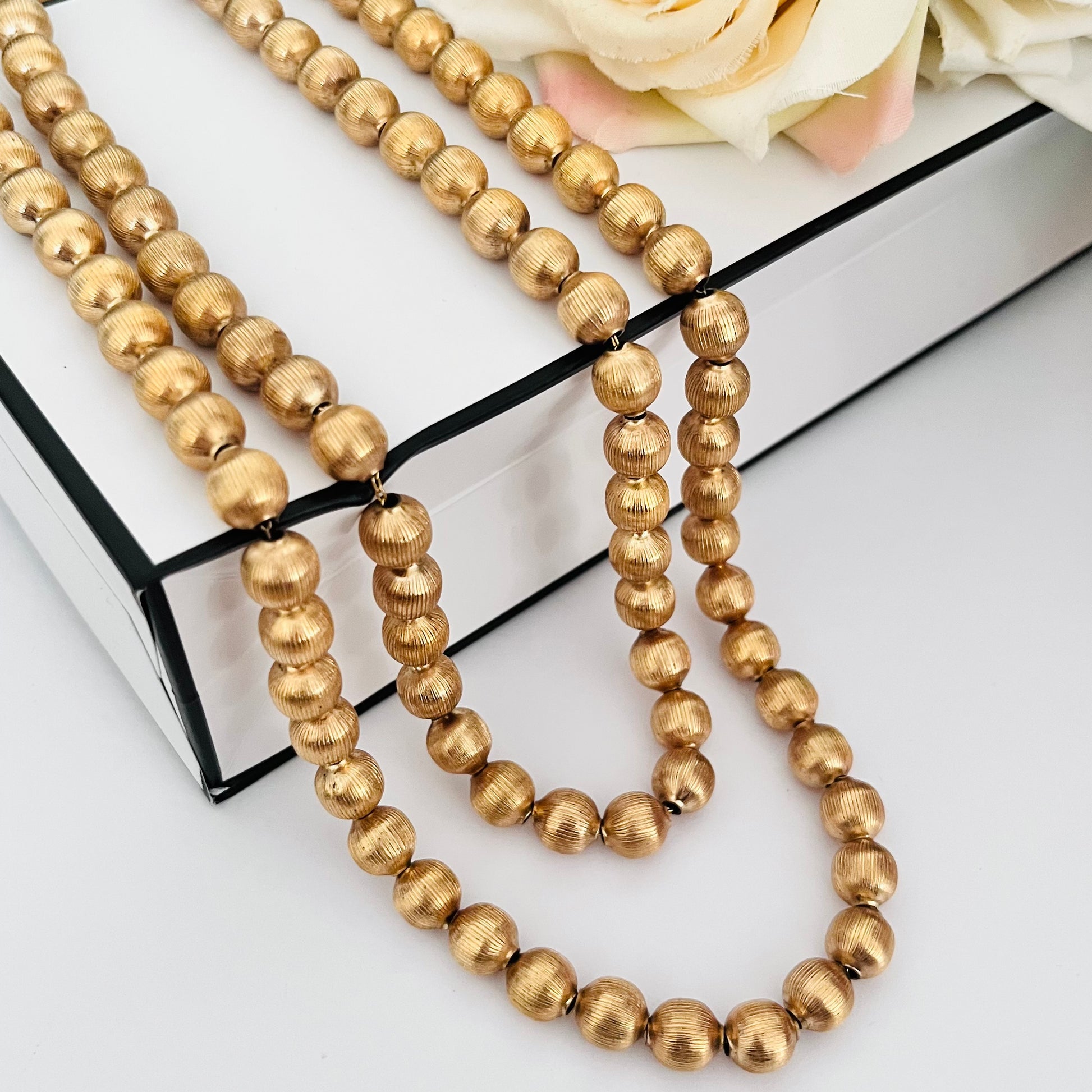 1960s Trifari Gold Plated Ball Chain Multistrand Statement Necklace. This stunning costume necklace really is a statement piece. With 2 stands of ball-chains plated in a brushed gold for a soft matte effect. The necklace showcases a timeless elegance that was present in the mid century 1960s era. The high-quality craftsmanship of Trifari ensures durability, while the unique design ensures that this necklace is a true one-of-a-kind vintage treasure. This designer necklace is a perfect gift for the signed vintage costume jewellery collector or anyone who appreciates the classic beauty of vintage pieces. It comes in a beautiful gift box, ready to be presented to your loved one or to add to your personal Trifari collection. The necklace is worn securely with it’s hinged clasp. The necklace comes complete with the signature Trifari Crown logo marked on the reverse of the clasp, a testament to their authenticity and quality.