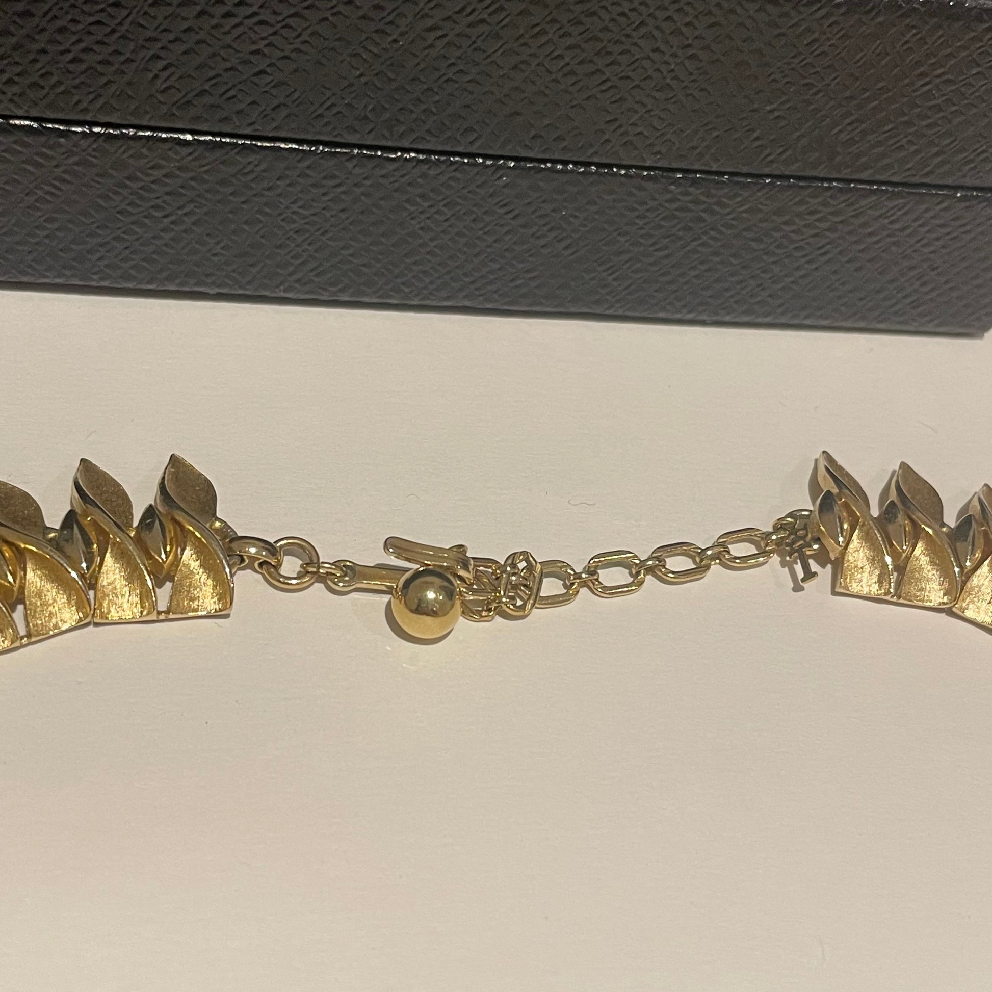 1960s Trifari Brutalist Brushed Gold Tone Statement Collar Necklace. This beautiful vintage piece is a true treasure, evoking the glamour and sophistication of the mid-century era. Crafted from high-quality brushed gold-tone metal for a soft matte look, this statement necklace features a series of interlocking links that create a unique and brutalist style design, this was a signature style of 1960s Trifari. The links are beautifully detailed with intricate etchings and texture. The designer necklace is easy to wear as it's length is adjustable to suit you, this necklace has a secure hook clasp. The collar necklace comes complete with the signature Trifari Crown charm and logo marked on the reverse of the clasp, a testament to their authenticity and quality. It also come beautifully packaged, making them an ideal gift for a lover of signed vintage costume jewellery or a Trifari collector.
