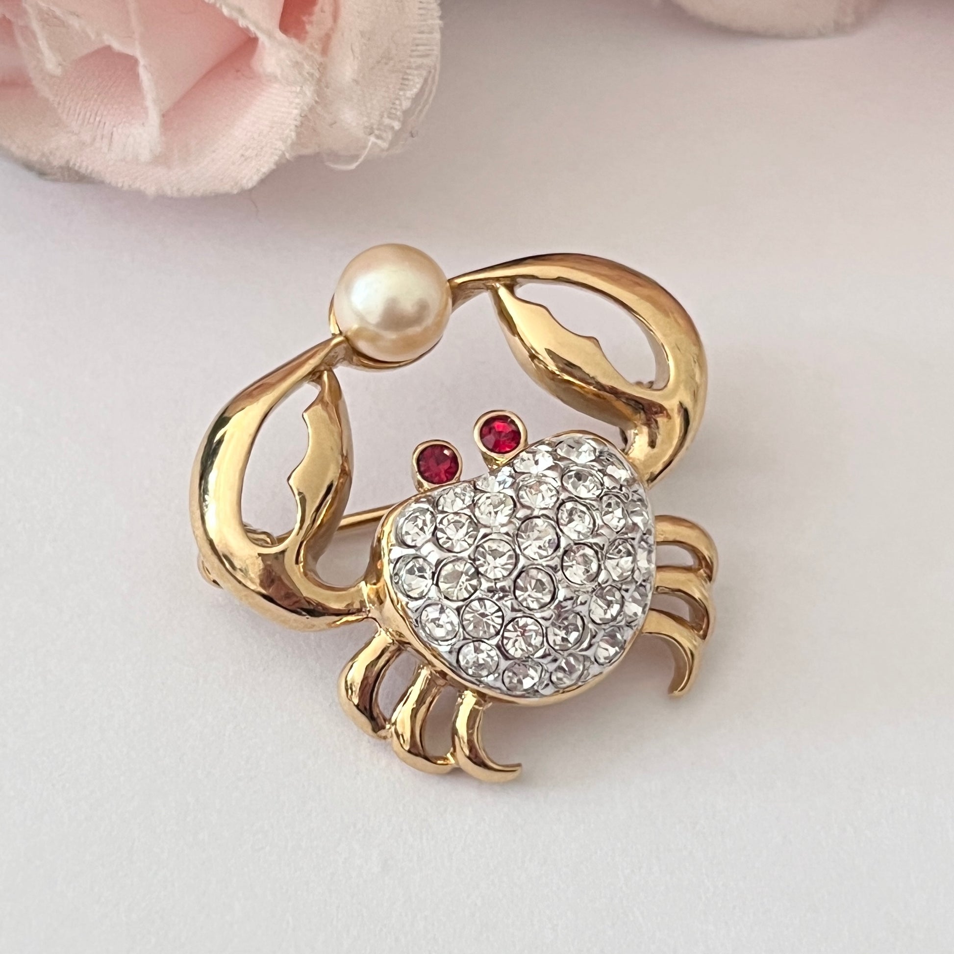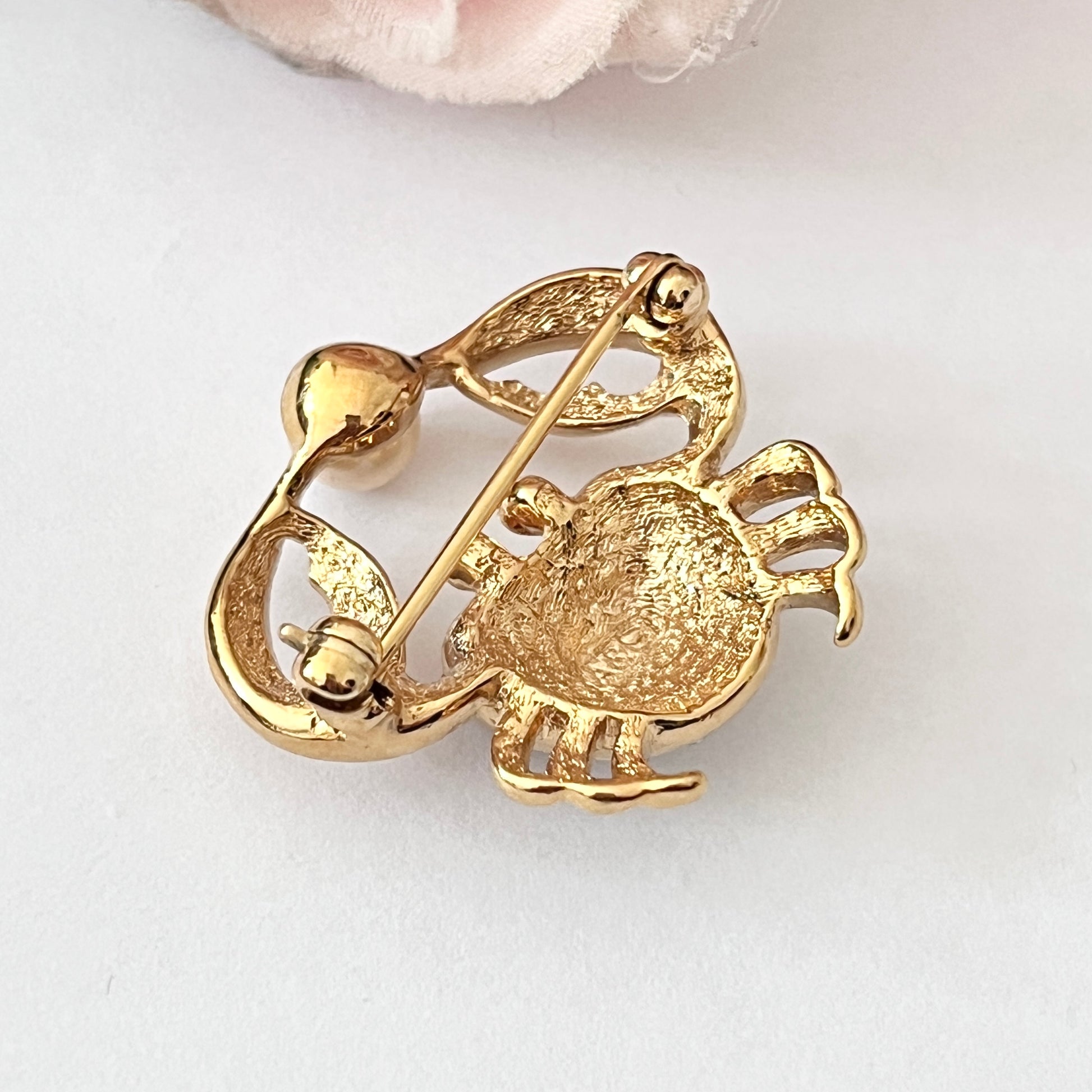 1980s Attwood & Sawyer Crab Faux Pearl Swarovski Crystals 22ct Gold Plated Brooch