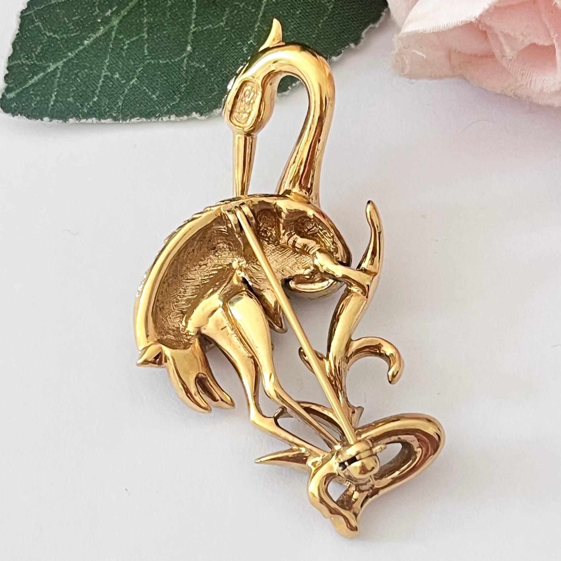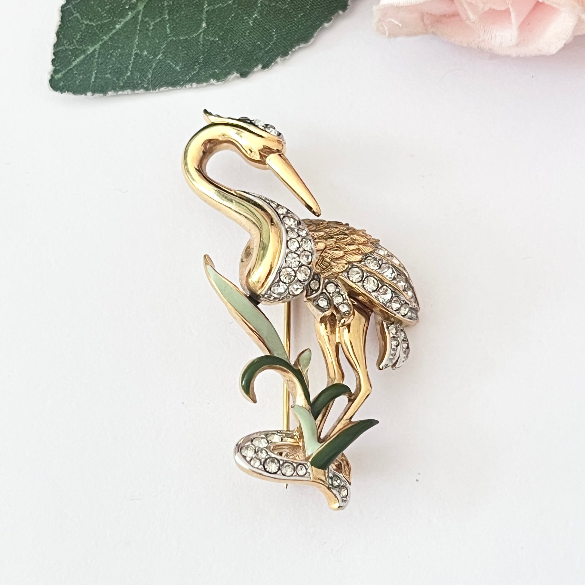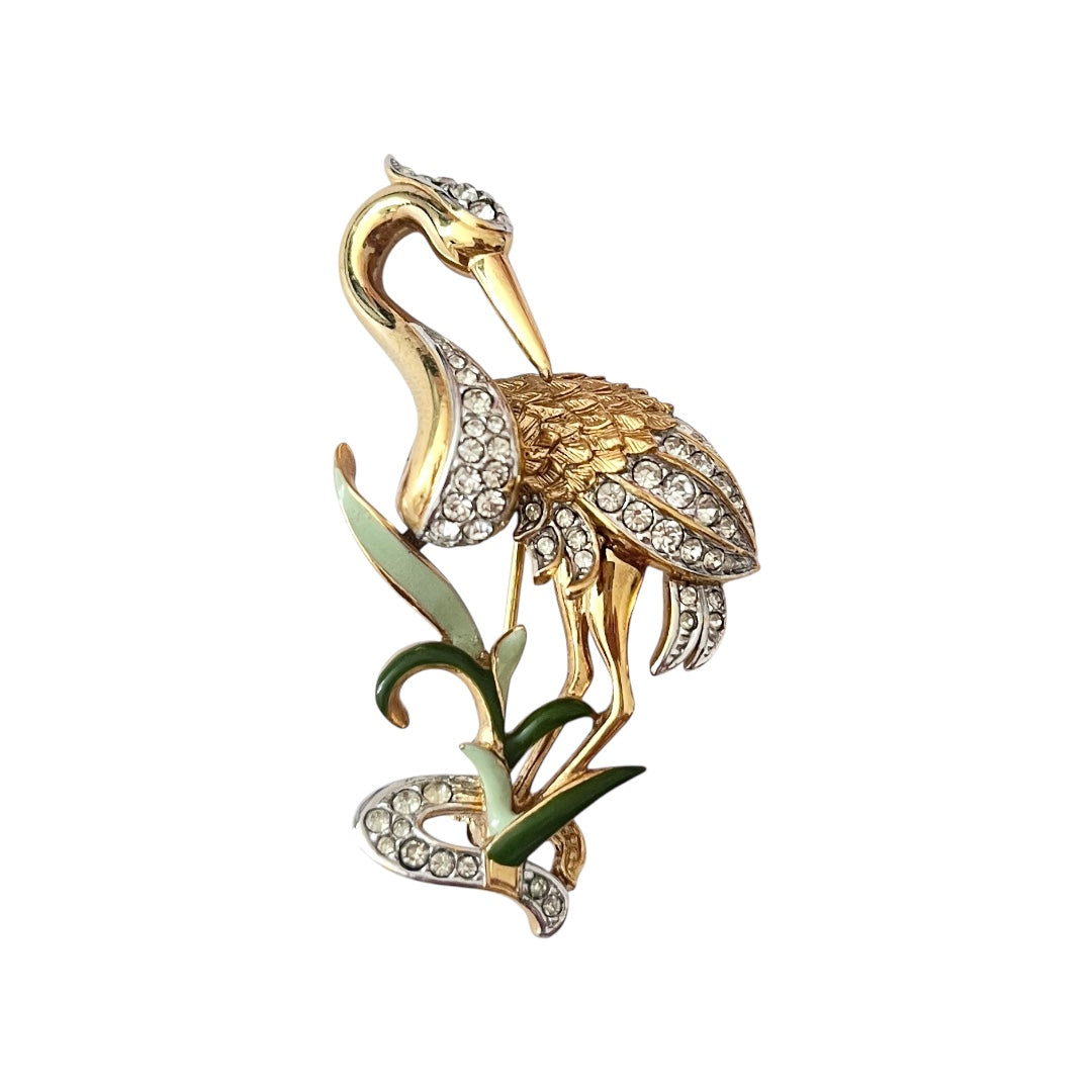 1980s Attwood & Sawyer Stork Green Wnamel Swarovski Crystals 22ct Gold Plated Brooch