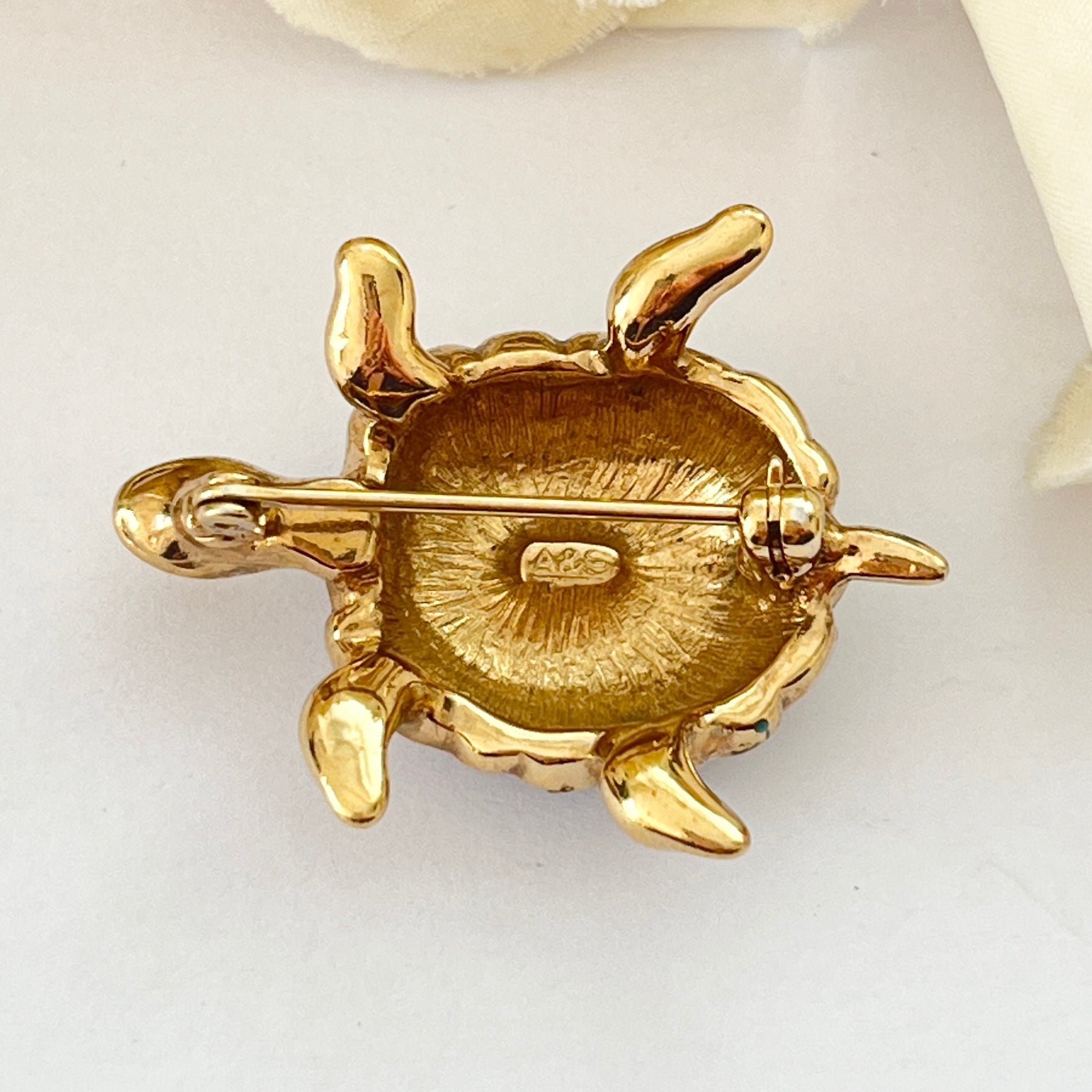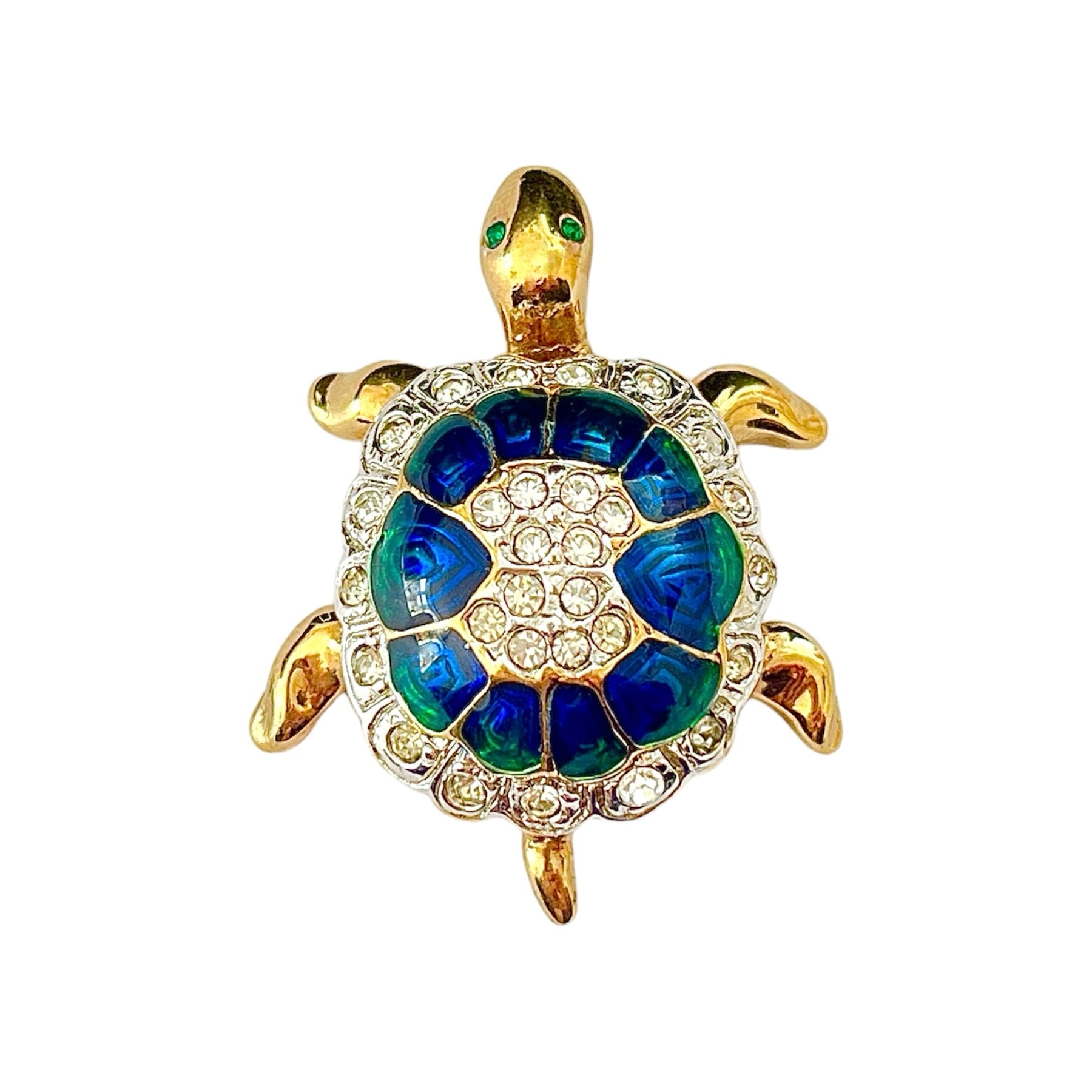 1980s Attwood & Sawyer Turtle Blue and Green Enamel Swarovski Crystals 22ct Gold Plated Brooch