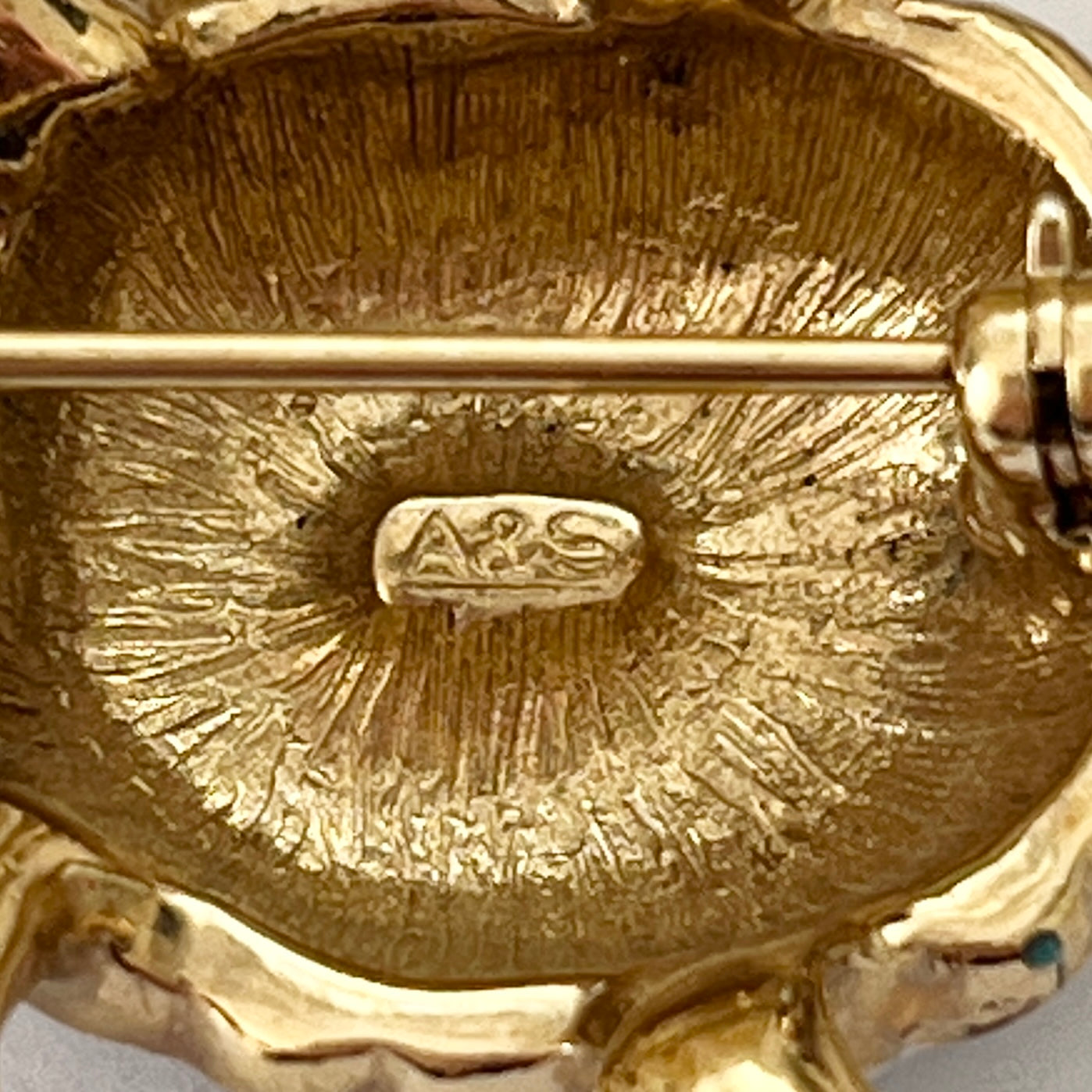1980s Attwood & Sawyer Turtle Blue and Green Enamel Swarovski Crystals 22ct Gold Plated Brooch. This rare brooch is a true vintage gem, embodying the glamour and style of the power dressing 1980s. Crafted from high-quality 22ct gold plated metal, this brooch features a blue and green enamel design, signature of any 80s statement piece. This designer turtle brooch is lined with sparkling swarovski crystals. This Attwood & Sawyer brooch catches the light beautifully and dazzles in the sunlight. This brooch sits securely on with its rollover pin clasp. This brooch is the perfect size to wear on a lapel, scarf or as a finishing touch to make a statement. The brooch comes complete with the signature A&S logo stamped on the back, a testament to its authenticity and quality. Whether it be for an Attwood and Sawyer collector or for a lover of signed vintage costume jewellery, this designer brooch is the perfect addition to your jewellery collection.