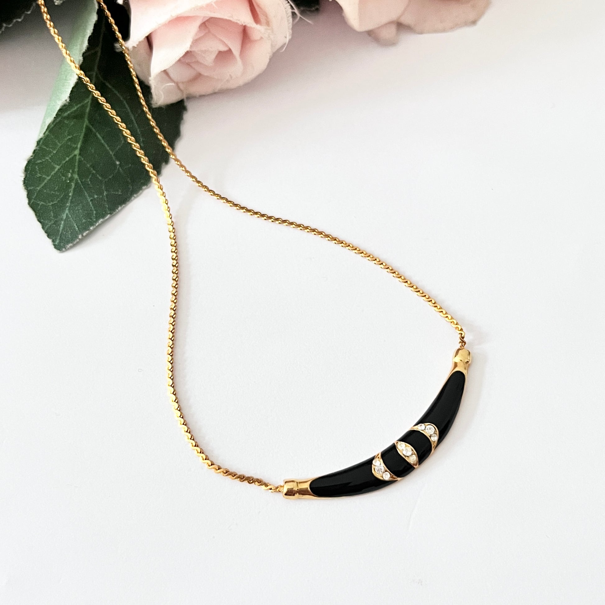 1980s Black Enamel Diamanté Gold Plated Chain Necklace. This stunning necklace features a gorgeous black enamel centre piece with sparkling diamantés. This necklace is worn securely with its lobster claw clasp. This statement necklace comes in a beautiful gift box, ready to be presented as a gift to a loved one or to add to your personal collection.