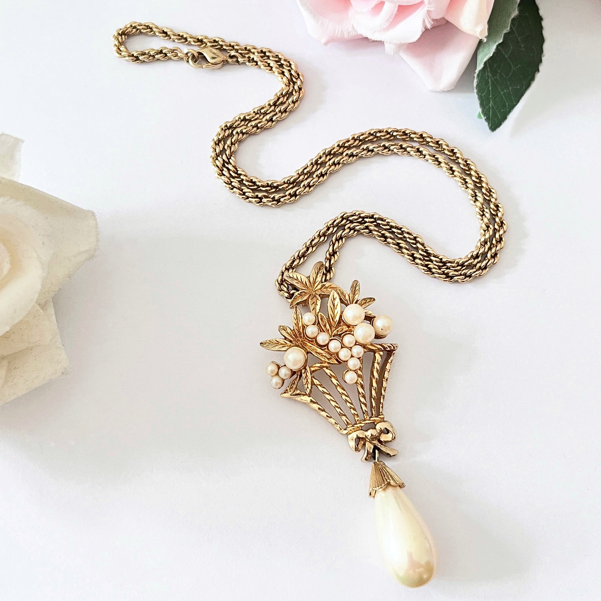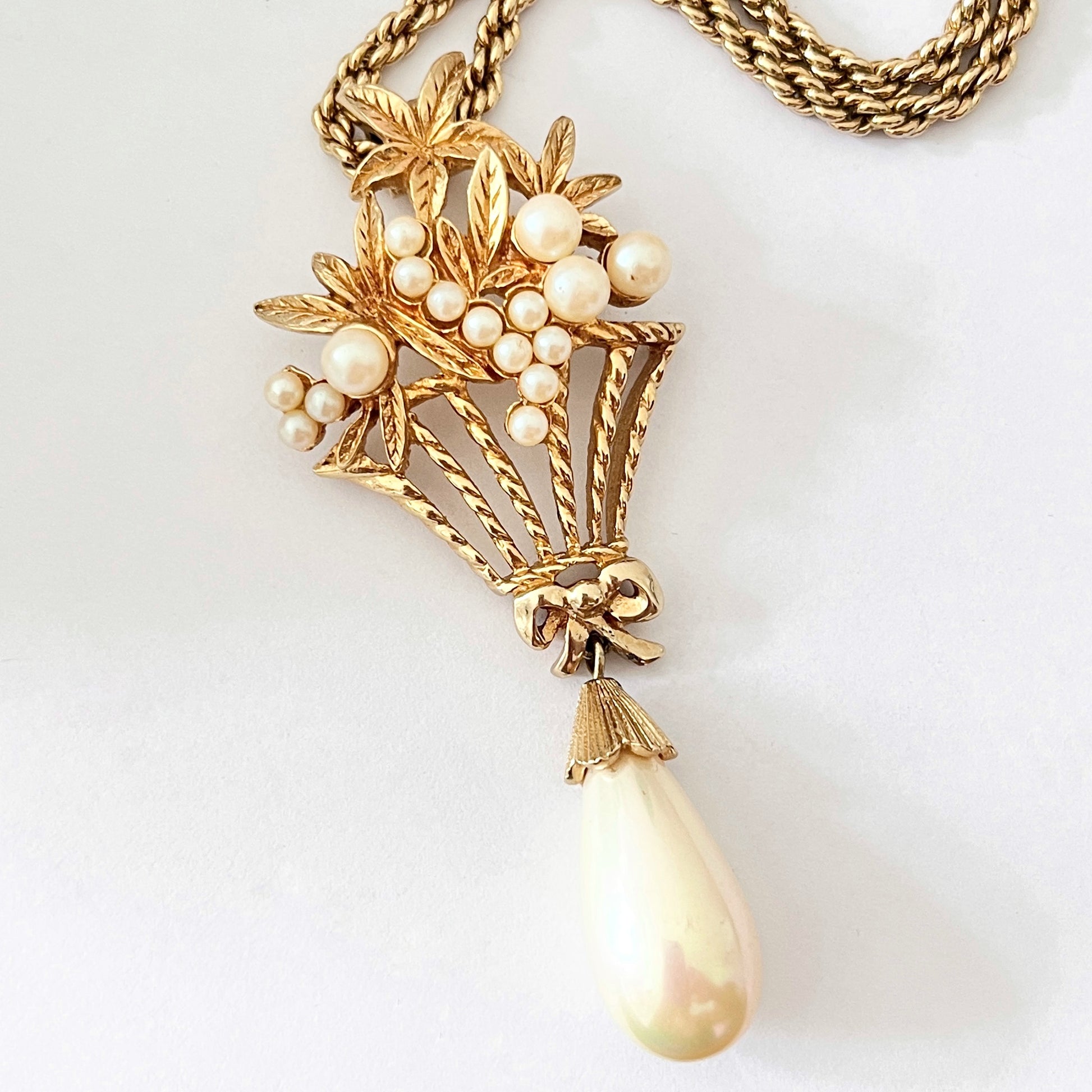 1980s Christian Dior Germany Flower Basket Gold Plated Faux Pearl Bow Pendant Necklace
