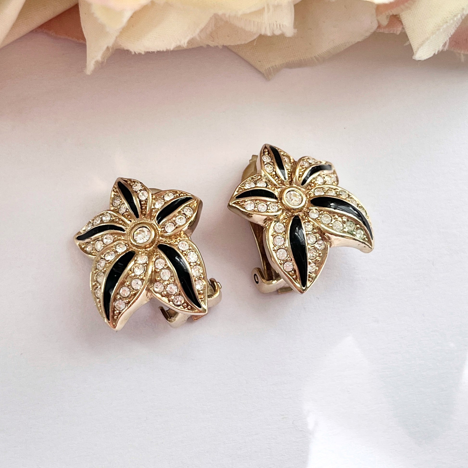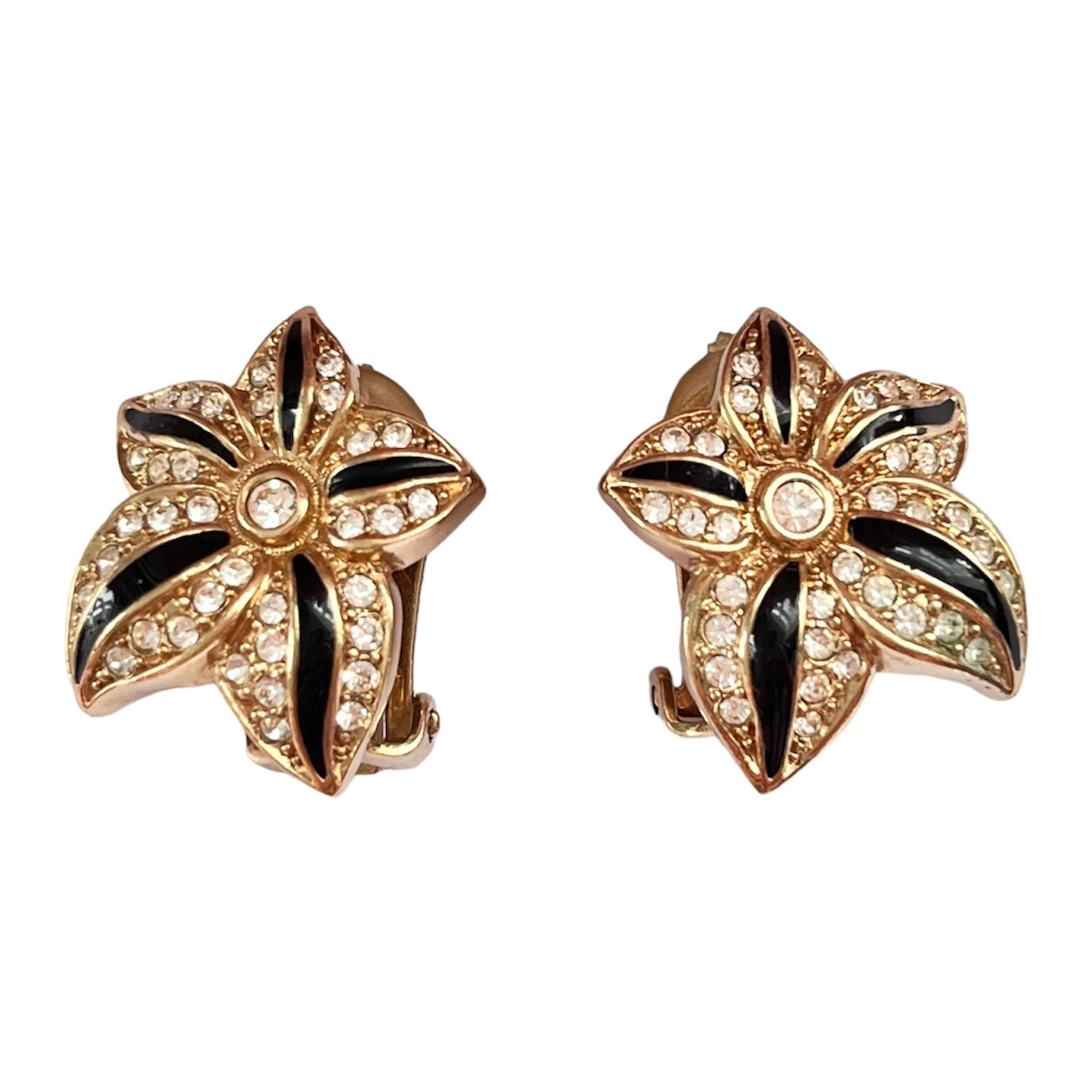 1980s Christian Dior Germany Gold Plated Black Enamel Diamanté Clip On Earrings