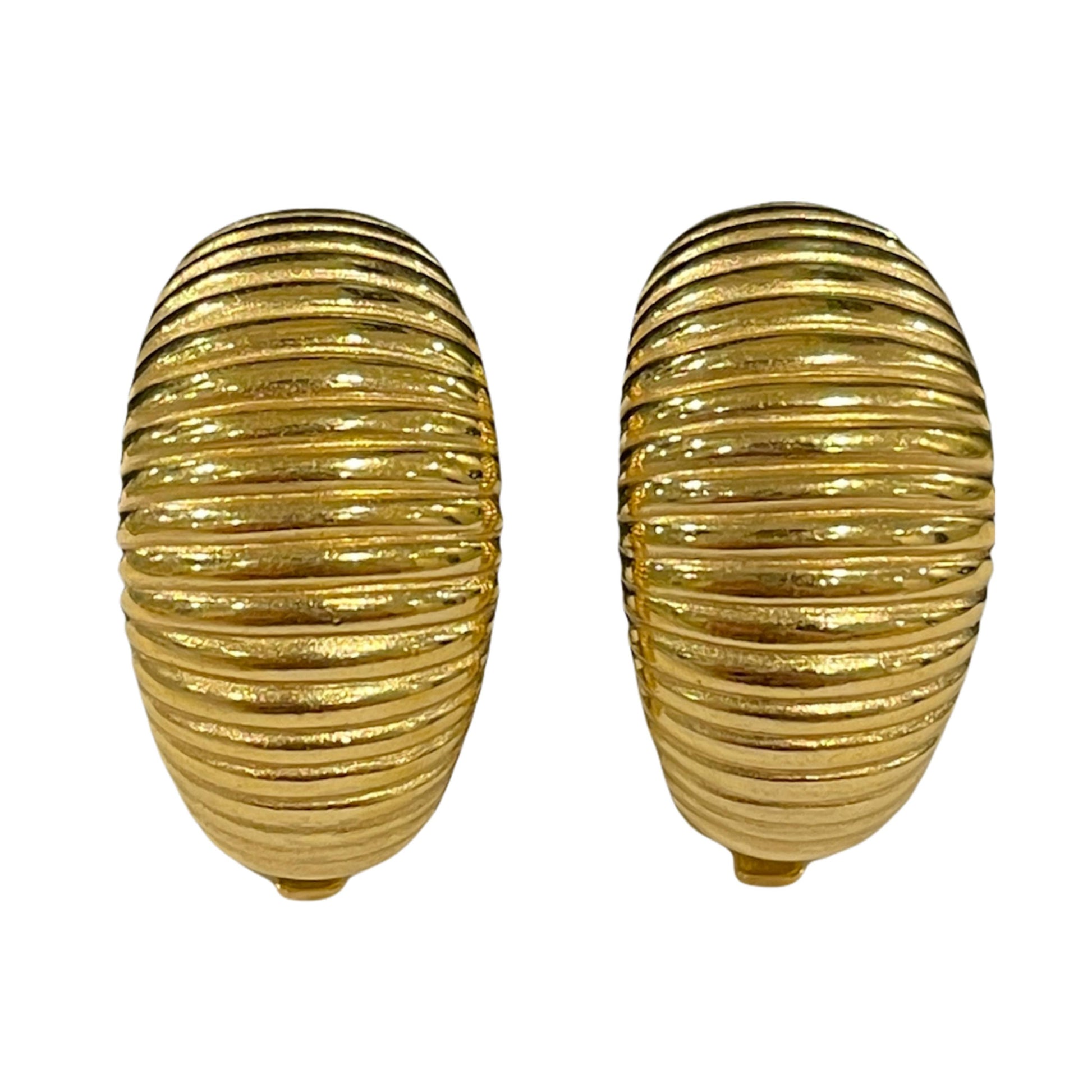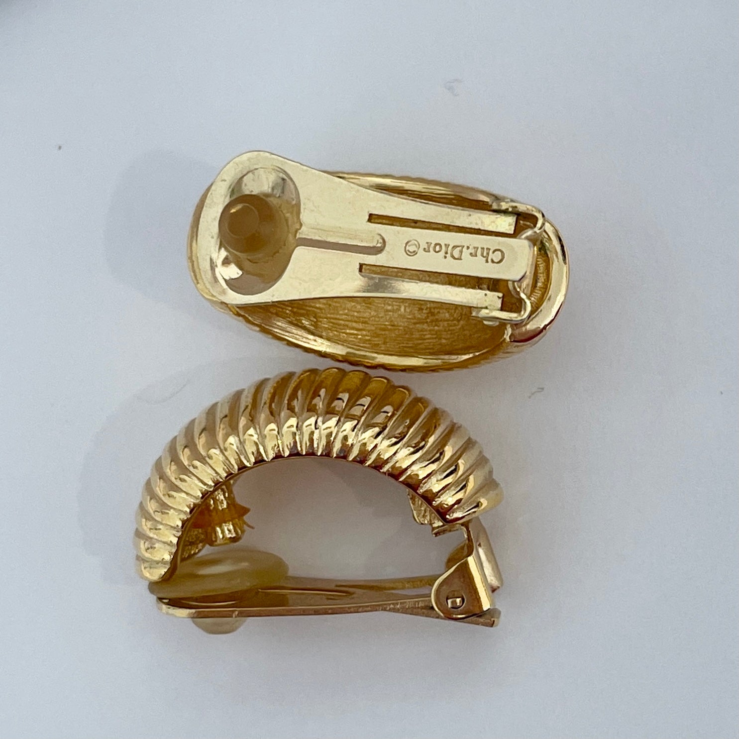 1980s Dior Classic Gold Plated Clip On Earrings, a true vintage treasure that exudes glamour and style. These clip on earrings are a stunning example of the high-quality craftsmanship that vintage Dior jewellery is renowned. Crafted from lustrous gold plated metal these earrings feature ribbed design. These earrings are comfortable to wear and suit all ears, even if they're not pierced. These power dressing earrings are incredibly versatile, making them perfect for a variety of occasions, from a casual day out to a more formal event. The earrings come complete with the signature Christian Dior logo marked on the back, a testament to their authenticity and quality. They also come beautifully packaged, making them an ideal gift for a lover of signed vintage costume jewellery or a Christian Dior collector. (Does not come in original designer packaging unless stated otherwise.)