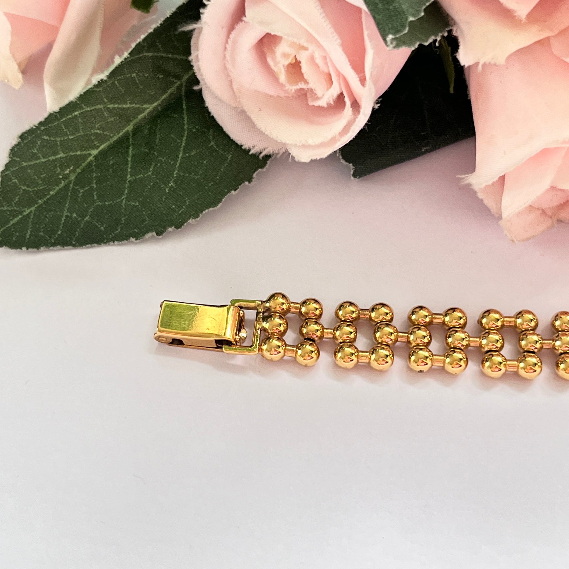1980s Gold Plated Chain Bracelet. The links sit comfortably on your wrist, making this piece perfect for everyday wear. Made from high-quality materials, this bracelet is a great addition to any vintage costume jewellery collection. The fold-over clasp ensures a secure fit, so you can wear it with confidence.