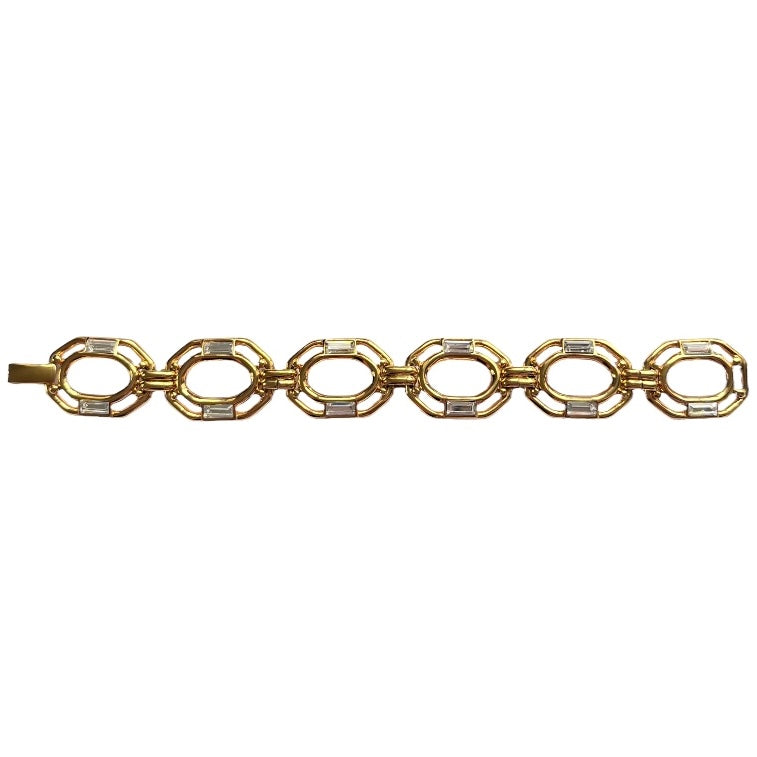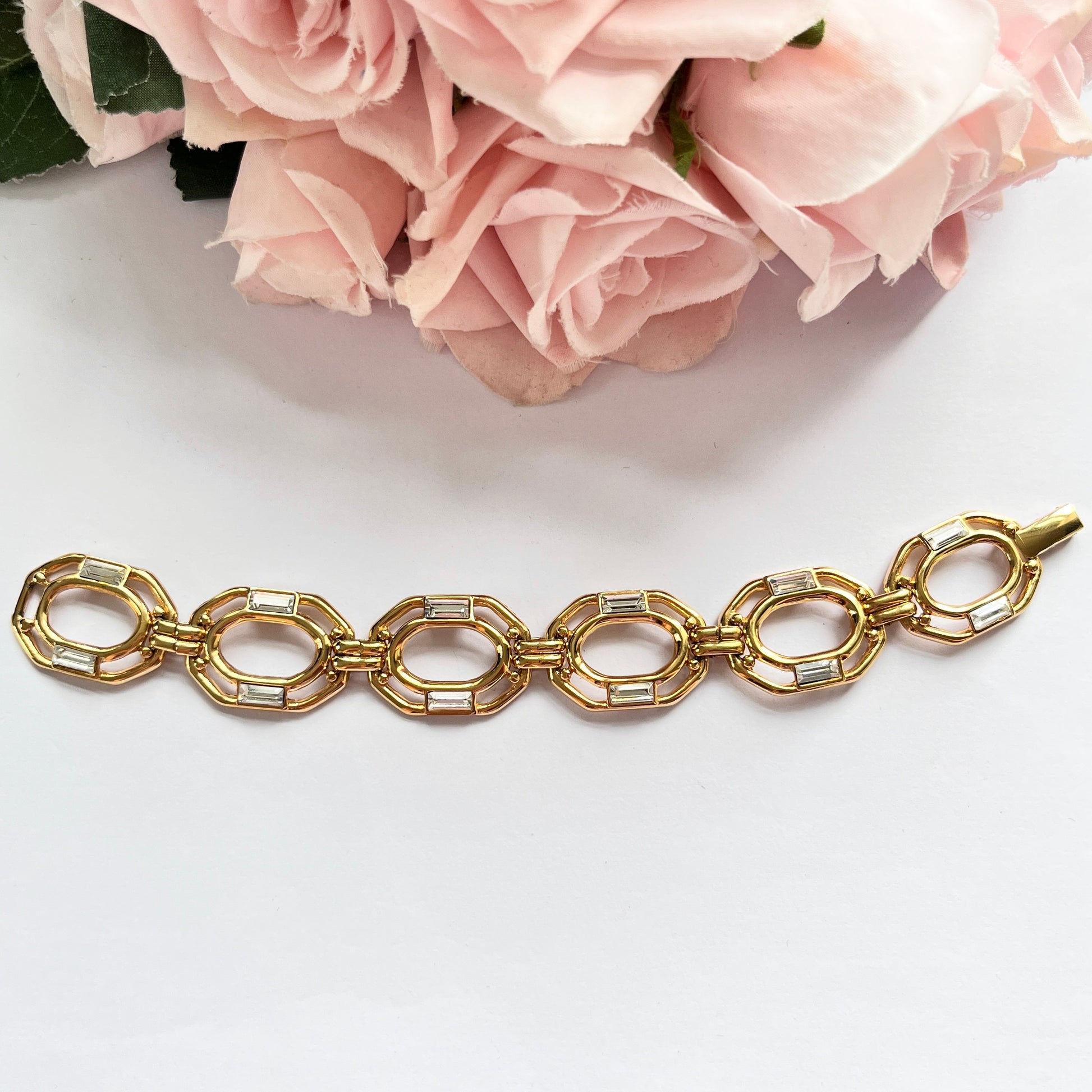1980s Gold Plated Diamanté Chain Bracelet. The links sit comfortably on your wrist, making this piece perfect for everyday wear. Featuring sparkling baguette cut diamantés. Made from high-quality materials, this bracelet is a great addition to any vintage costume jewellery collection. The fold-over clasp ensures a secure fit, so you can wear it with confidence.