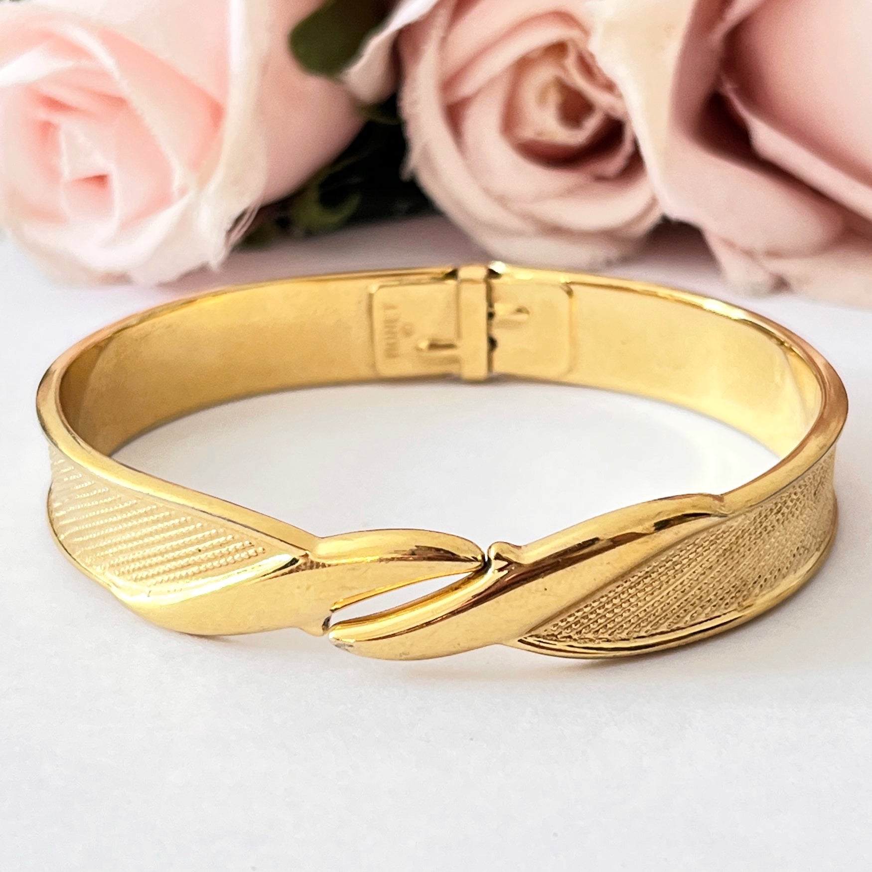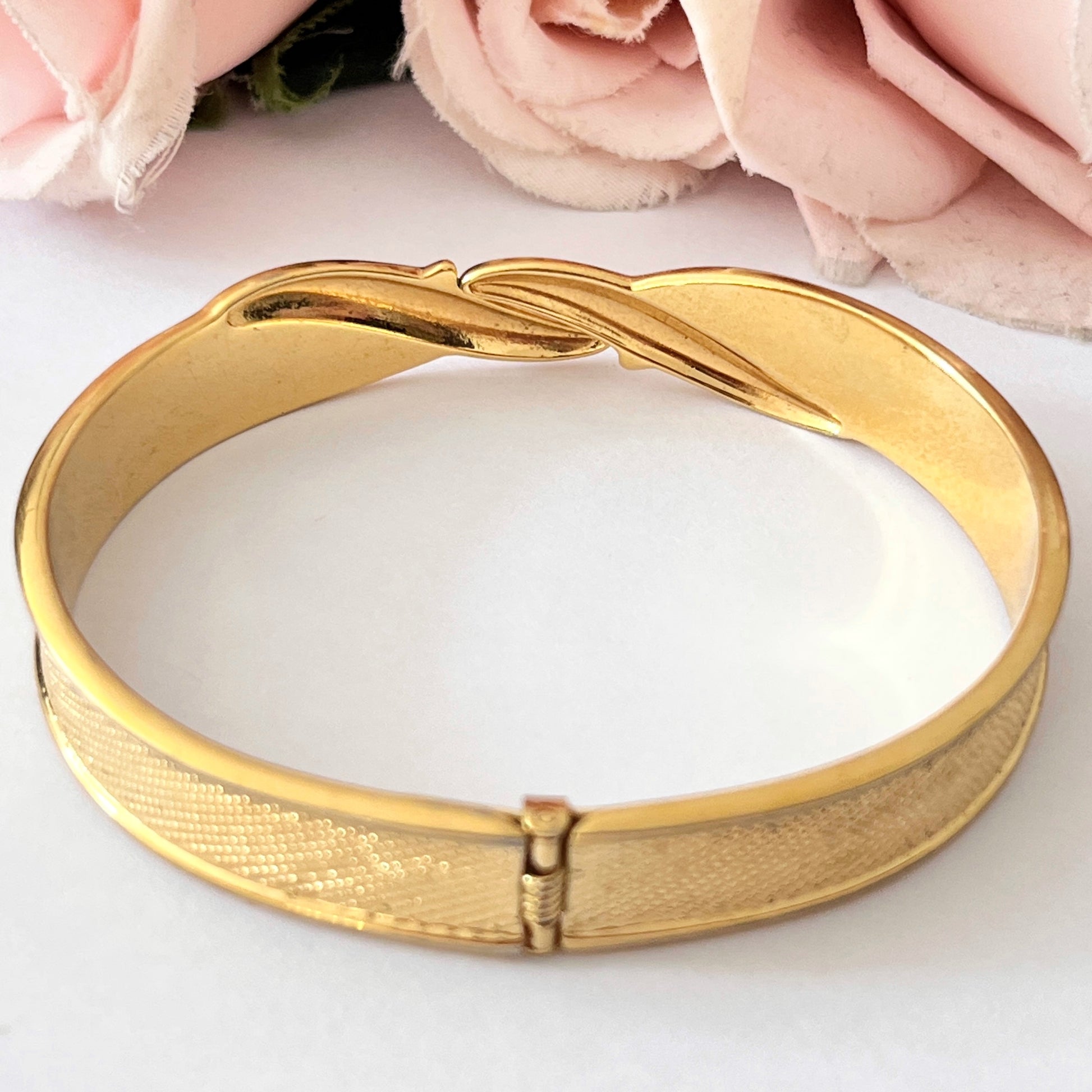 1980s Monet Gold Plated Bangle. A beautiful gold plated bangle. Vintage from the 1980s. This bracelet is in great quality considering it’s vintage age. Clearly marked with Monet’s signature logo. Bracelet sits securely on with it’s snap open and closing feature.