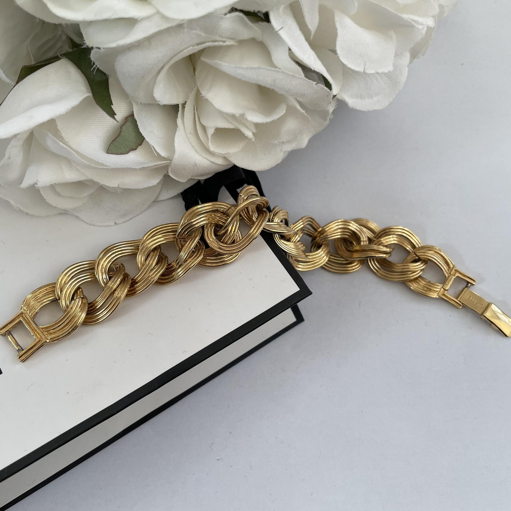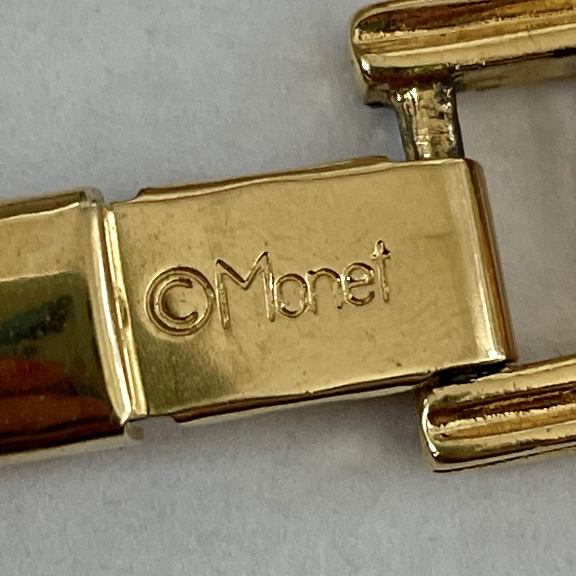 1980s Monet Gold Plated Chunky Chain Bracelet. Crafted with exquisite attention to detail, this bracelet boasts a classic design that never goes out of style. The Monet bracelet features a series of interlocking curb links. The links sit comfortably on your wrist, making this piece perfect for everyday wear or special occasions. Made from high-quality materials that Monet is renowned for, this bracelet is a great addition to any signed vintage costume jewellery collection. The hinged clasp ensures a secure fit, so you can wear it with confidence. It comes in a beautiful gift box, ready to be presented to your loved one or to add to your personal Monet collection. The bracelet comes complete with the signature Monet logo marked on the reverse of the clasp, a testament to their authenticity and quality. (Does not come in original designer box unless stated otherwise.)
