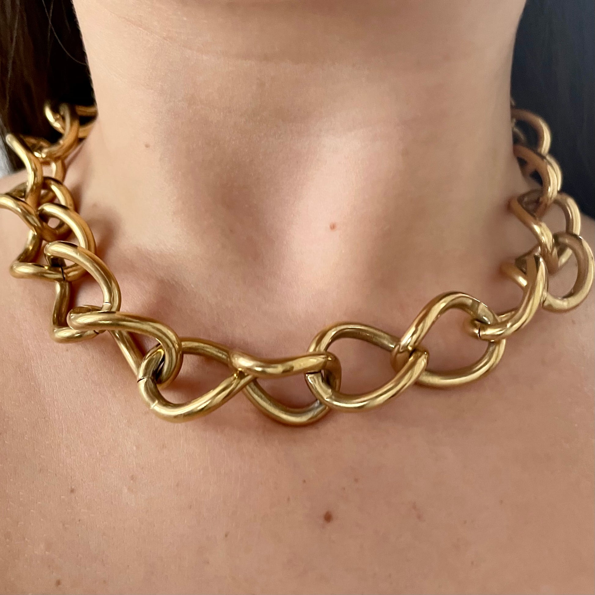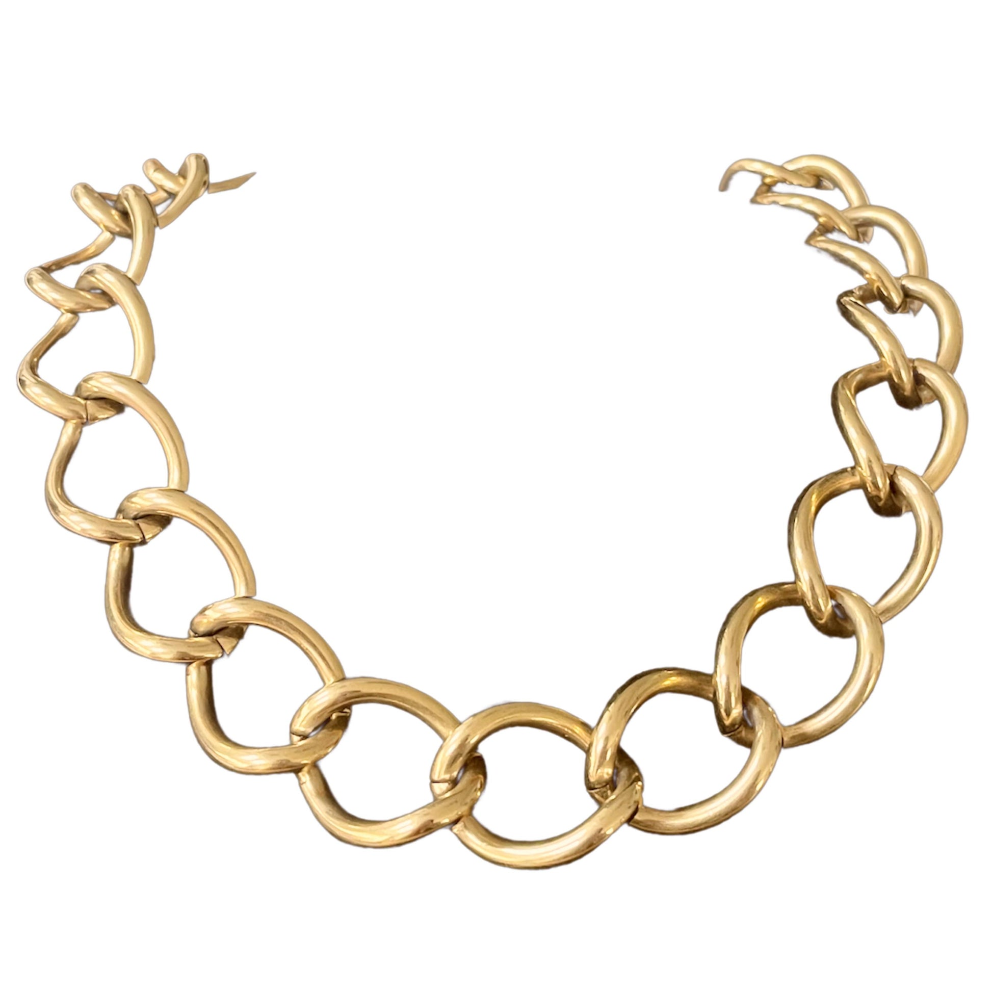 1980s Monet Gold Plated Chunky Chain Necklace. This stunning costume necklace really is a statement piece. Crafted with exceptional quality and attention to detail, this vintage necklace features a gold plated wide open rolo chain that hangs nicely from the neck. The necklace showcases a timeless elegance that was present in the power dressing 1980s era. The high-quality craftsmanship of Monet ensures durability, while the unique design ensures that this necklace is a true one-of-a-kind vintage treasure. This style of necklace is perfect for anyone who wants to add a touch of luxury to your everyday look, a gold chain necklace can really elevate any outfit. It is perfect for day to day and formal wear. This designer necklace is a perfect gift for the signed vintage costume jewellery collector or anyone who appreciates the classic beauty of vintage pieces. It comes in a beautiful gift box, ready to be presented to your loved one or to add to your personal Monet collection. The necklace is worn securely with its toggle clasp. The necklace comes complete with the signature Monet logo tag, a testament to their authenticity and quality. (Does not come in the original designer box unless stated otherwise)