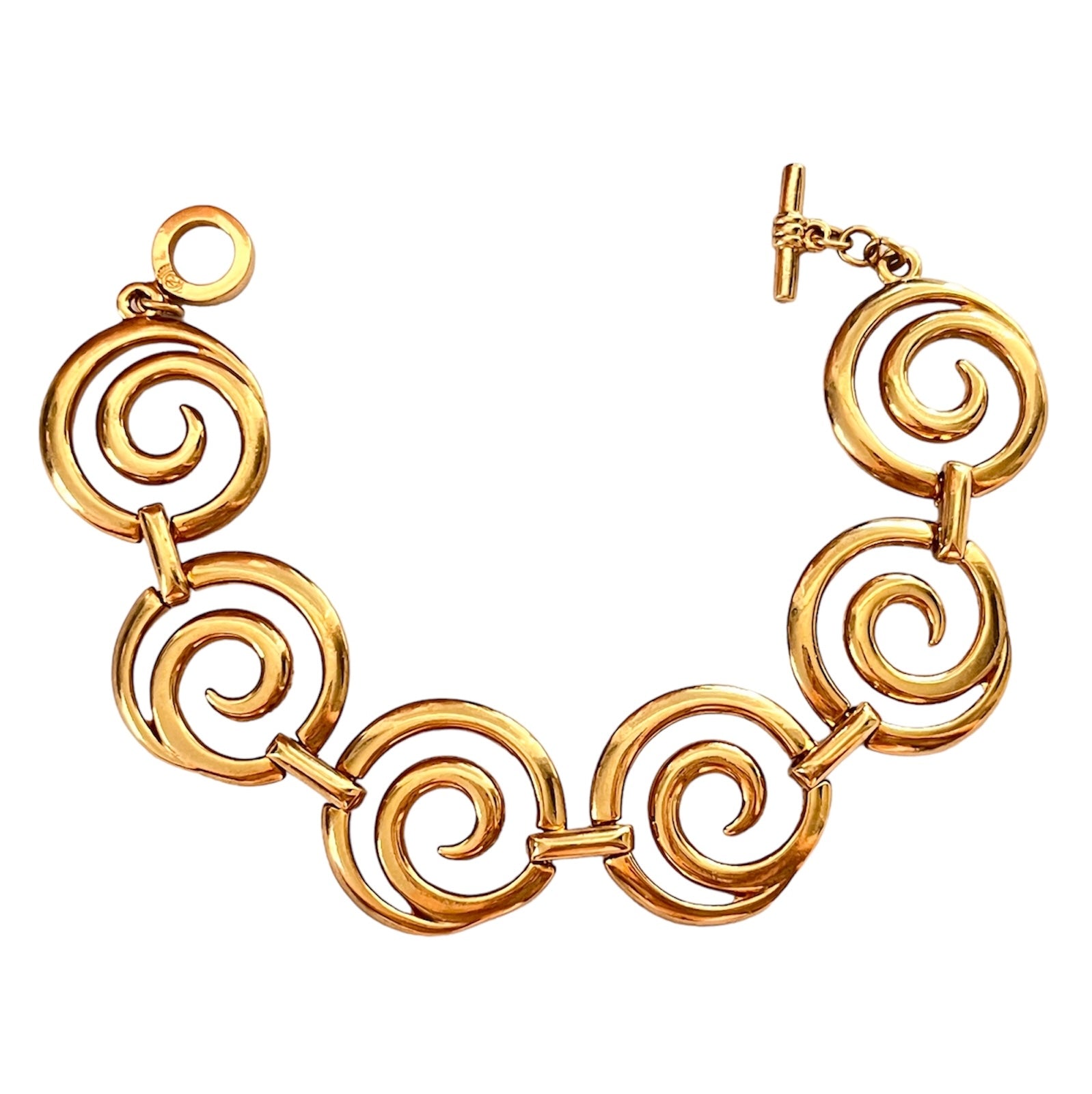 1960s Napier Gold Plated Swirl Chain Bracelet. This bracelet is vintage from the 1960s making it a rare Napier find. The Napier bracelet features a series of swirl shaped circles. The toggle clasp ensures a secure fit, so you can wear it with confidence. It comes in a beautiful gift box, ready to be presented to your loved one or to add to your personal Napier collection. The bracelet comes complete with an Napier logo marked on the reverse, a testament to their authenticity and quality. (Does not come in original designer box unless stated otherwise.)