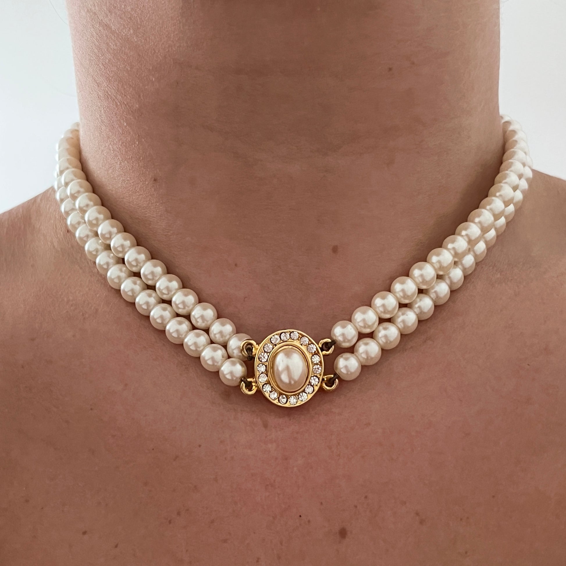 1980s Faux Pearl Diamanté Multistrand Collar Necklace, a beautiful and unique vintage piece. This stunning necklace features a gorgeous gold plated pendant that is lined with sparkling diamantés. With 2 strings of faux pearls either side. This necklace is designer to be worn as a collar. This statement necklace comes in a beautiful gift box, ready to be presented as a gift to a loved one or to add to your personal vintage costume jewellery collection.